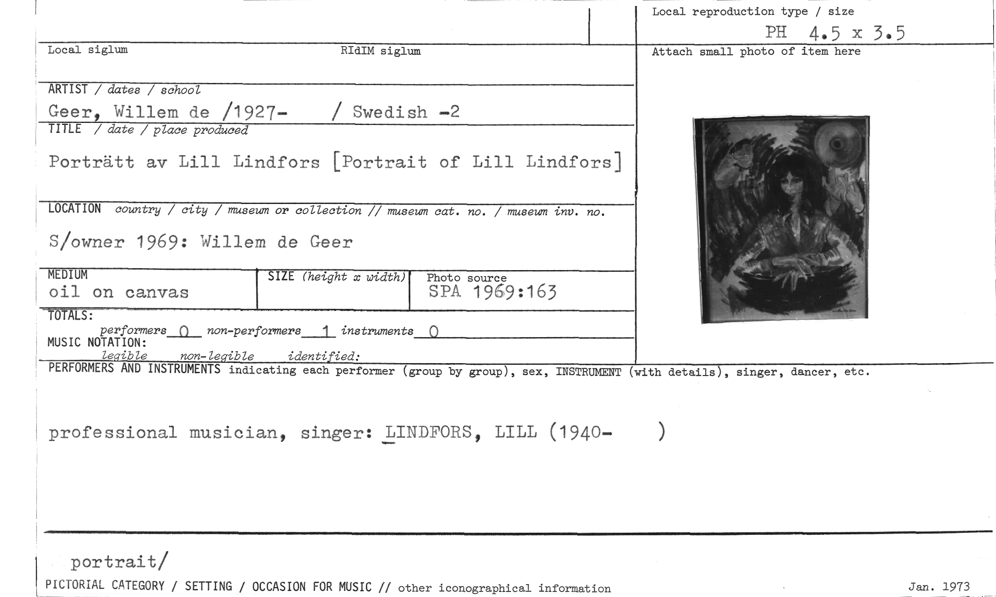 //// Local reproduction type / size //// PH 4.5 x 3.5 //// Attach small photo of item here //// dates //// Geer, Willem de /1927— / Swedish —2 //// TITLE / date / place produced //// Porträtt av Lill Lindfors [Portrait of Lill Lindfors] //// LOCATION country / city / museum or collection // museum cat. no. / museum 2nv. no. //// S/owner 1969: Willem de Geer //// SIZE (height x width) //// —ÖTÅLS:— //// performers__CL_non-performera___1_ instruments 0 MUSIC NOTATION: //// le•ible non-le ible identi ied: //// PERFORMERS AND INSTRUMENTS indicating each performer (group by group), sex, INSTRUMENT (with details), singer dancer etc. //// professional musician, singer: LINDFORS„ LILL (1940— //// Local siglum RIdIM siglum //// MEDIUM //// oil on canvas //// Photo source //// SPA 1969:163 //// portrait/ //// PICTORIAL CATEGORY / SETTING / OCCASION FOR MUSIC // other iconographical information //// Jan. 1973 ////