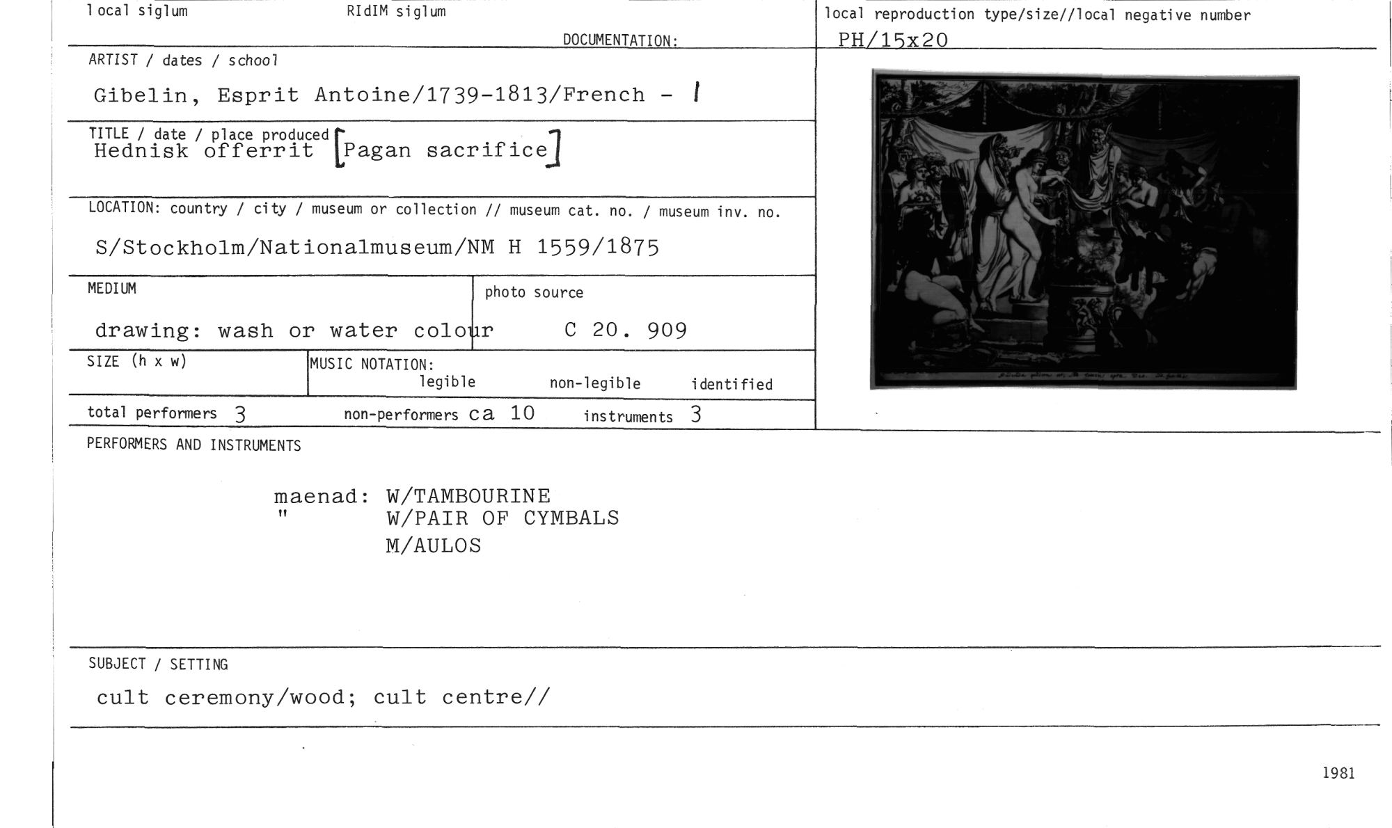 //// PERFORMERS AND INSTRUMENTS //// maenad: W/TAMBOURINE //// W/PAIR OF CYMBALS //// M/AULOS //// SUBJECT / SETTING //// cult ceremony/wood; cult centre// //// MUSIC NOTATION: //// legible //// non-legible identified //// instruments 3 //// total performers 3 non-performers ca 10 //// 1 ocal siglum RIdIM siglum //// DOCUMENTATION: //// local reproduction type/size//local negative number //// PH/15x20 //// ARTIST / dates / school //// Gibelin, Esprit Antoine/1739-1813/French - 1 //// TITLE / date / place produced //// Hednisk offerrit ['agan sacrificej //// LOCATION: country / city / museum or collection // museum cat. no. / museum inv. no. //// S/Stockholm/Nationalmuseum/NM H 1559/1875 //// MEDIUM //// drawing: wash or water colour C 20. 909 //// SIZE (h x w) //// photo source ////