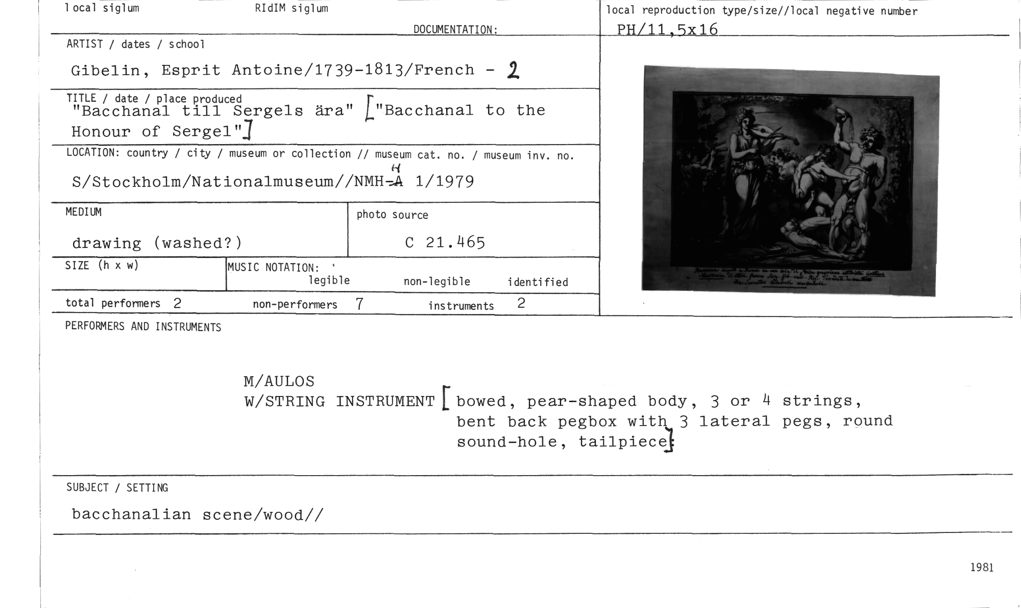 //// 1 ocal siglum RIdIM siglum //// DOCUMENTATION. //// local reproduction type/size//local negative number //// PH/11 5x16 //// ARTIST / dates / school //// Gibelin, Esprit Antoine/1739-1813/French - i //// TITLE / date / place produced //// "Bacchanal till Sergels ära" L"Bacchanal to the Honour of Serge1"1 //// LOCATION: country / city / museum or collection // museum cat. no. / museum inv. no. //// S/Stockholm/Nationalmuseum//NMH,A 1/1979 //// photo source //// C 21.465 //// SIZE (h x w) //// non-legible identified //// MEDIUM //// drawing (washed?) //// MUSIC NOTATION: ' //// legible //// total performers 2 non-performers 7 instruments 2 //// PERFORMERS AND INSTRUMENTS //// M/AULOS //// W/STRING INSTRUMENT rbowed, pear-shaped body, 3 or 4 strings, bent back pegbox with 3 lateral pegs, round sound-hole, tailpiece //// SUBJECT / SETTING //// bacchanalian scene/wood// //// 1981 ////