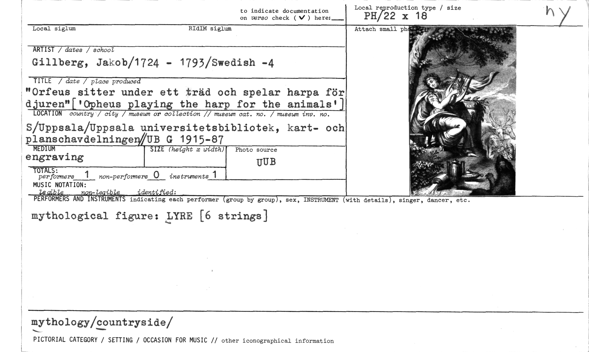 //// ARTIST / dates / school //// Gillberg, Jakob/1724 - 1793/Swedish -4 //// TITLE / date / place produced //// "Orfeus sitter under ett träd och spelar harpa för //// djuren"['Opheus playing the harp for the animalsl] //// LOCATION countryJ city / museum or collection // museum cat. no. / museum inr. no. //// S/Uppsala/Uppsala universitetsbibliotek, kart- och //// -T6TALS: //// per formers 1 non-performers 0 instruments 1 //// INSTRUMENT (with //// to indicate documentation on verso check (V ) //// Photo source //// UUB //// MUSIC NOTATION: //// tecitle non-legible iciented: //// PERFORMERS AND INSTRUMENTS indicating each performer (group by group), sex, //// mythological figure: LYRE [6 strings] //// Local reproduction type / size //// PH/22 x 18 //// planschavdelningen/1UB G 1915-87 //// MEDIUM SIZE (height x width) //// engraving //// details), singer, dancer, //// etc. //// Local siglum //// Attach small ph //// RIdIM siglum //// mythology/countryside/ //// PICTORIAL CATEGORY / SETTING / OCCASION FOR MUSIC // other iconographical information ////