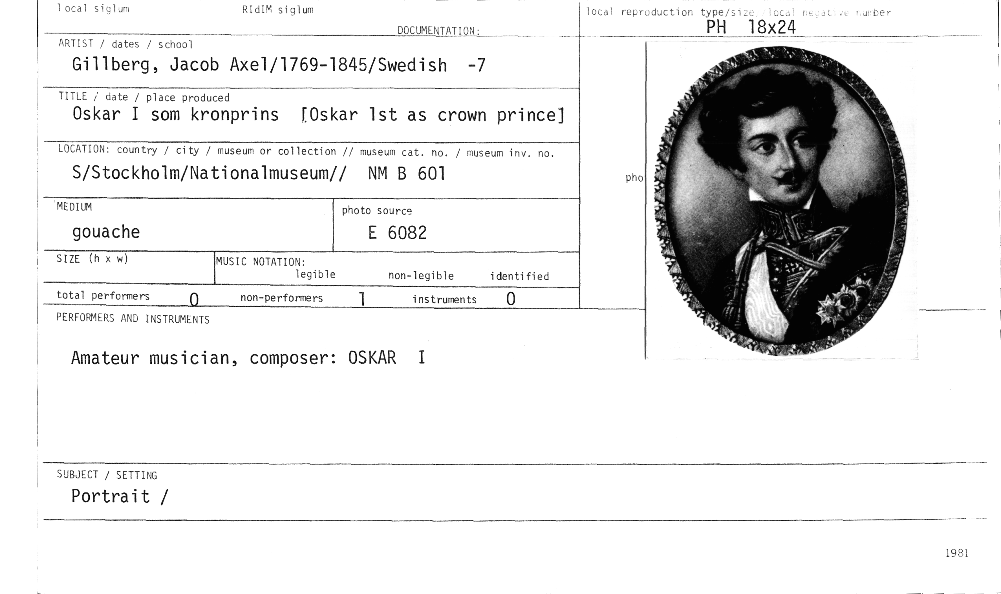 //// 1 ocal siglum //// e number //// RIdIM siglum //// DOCUMENTATION• //// lotal reproduction type/size, local ne:a //// PH 18x24 //// ARTIST / dates / school //// Gillberg, Jacob Axel/1769-1845/Swedish -7 //// TITLE / date / place produced //// Oskar I som kronprins [Oskar lst as crown prince] //// LOCATION: country / city / museum or collection // museum cat. no. / museum inv. no. //// S/Stockholm/Nationalmuseum// NM B 601 //// pho //// MEDIUM //// photo source //// E 6082 //// gouache //// SIZE (h x w) //// MUSIC NOTATION: //// legible //// non-legible identified //// instruments //// 0 //// PERFORMERS AND INSTRUMENTS //// Amateur musician, composer: OSKAR I //// SUBJECT / SETTING //// Portrait / //// 1981 ////