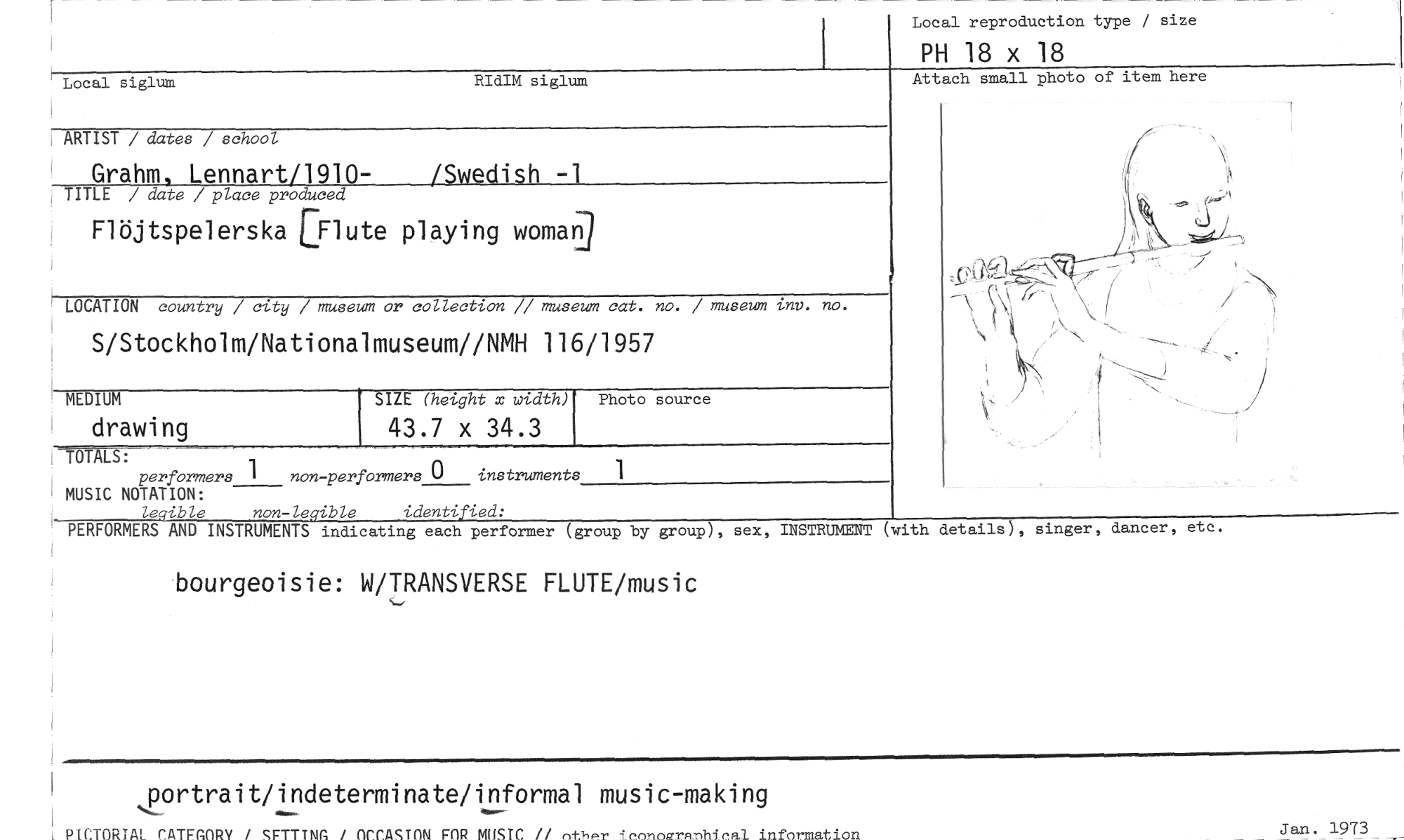 //// bourgeoisie: W/TRANSVERSE FLUTE/music //// portrait/indeterminate/informal music-making //// Attach small photo of item here //// Photo source //// SIZE (height x width) //// 43.7 x 34.3 //// MEDIUM //// drawing //// S: //// Local reproduction type / size //// PH 18 x 18 //// I ARTIST / dates / school //// Grahm, Lennart/1910- /Swedish -1 //// TITLE / date / place produced //// Flöjtspelerska CFlute playing woman] //// LOCATION country / city / museum or collection // museum cat. no. / museum inv. no. //// S/Stockholm/Nationalmuseum//NMH 116/1957 //// Local siglum //// RIdIM siglum //// performera 1 non-performers 0 instruments 1 //// MUSIC NOTATION: //// le•ible non-le ible identi ied: //// PERFORMERS AND INSTRUMENTS indicating each performer (group //// by group), sex, INSTRUMENT (with details), singer, dancer, etc. //// PICTORTAL CATFAORY / SFTTTNR / ncrasTm FOR MUSIC // nther i_conneranhical information Jan. 1973 . ////