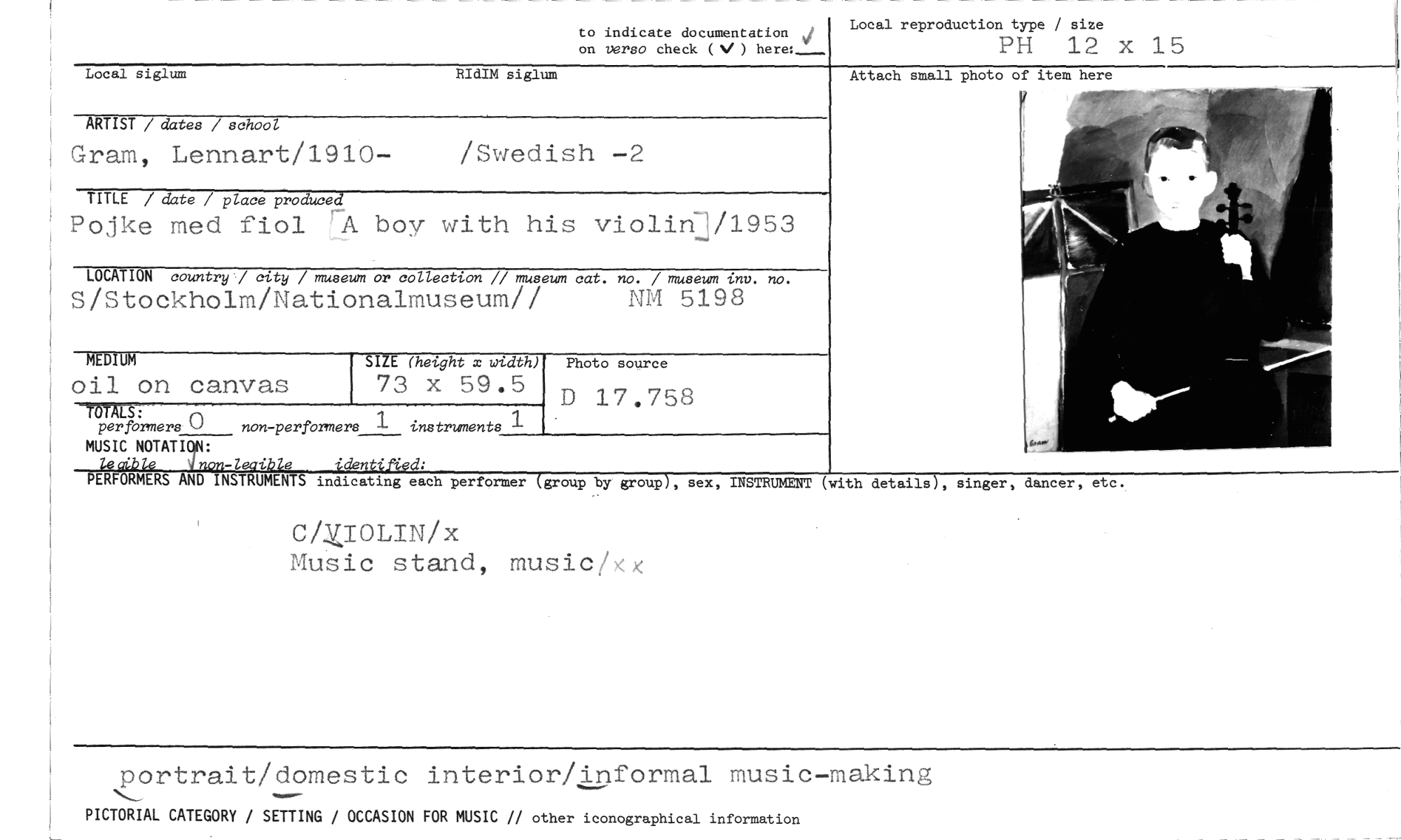 //// to indicate documentation //// Local reproduction type / size //// on verso check (V) here:- vi //// PH 12 X 15 //// Local siglum RIdIM siglum //// Attach small photo of item here //// ARTIST / dates / school //// Gram, Lennart/1910- /Swedish -2 //// TITLE / date / place produced //// Pojke med fiol Ps. boy with his violin]/1953 //// LOCATION country / city / museum or collection // museum cat. no. / museum tnv. no. //// S/Stockholm/Nationalmuseum// NM 5198 //// SIZE (hetght x width) //// 73 x 59.5 //// MALS: //// per formera () non-performers 1 instruments //// MUSIC NOTATICIN: //// leci.bLe 4non-leaible identijied: //// PERFORMERS AND INSTRUMENTS indicating each performer (group by group), sex, INSTRUMENT (with details), singer, dancer, etc. //// CUIOLIN/x //// Music stand, music/Kx //// MEDIUM //// oil on canvas //// D 17.758 //// Photo source //// portrait/domestic interior/informal music-making //// PICTORIAL CATEGORY / SETTING / OCCASION FOR MUSIC // other iconographical information ////