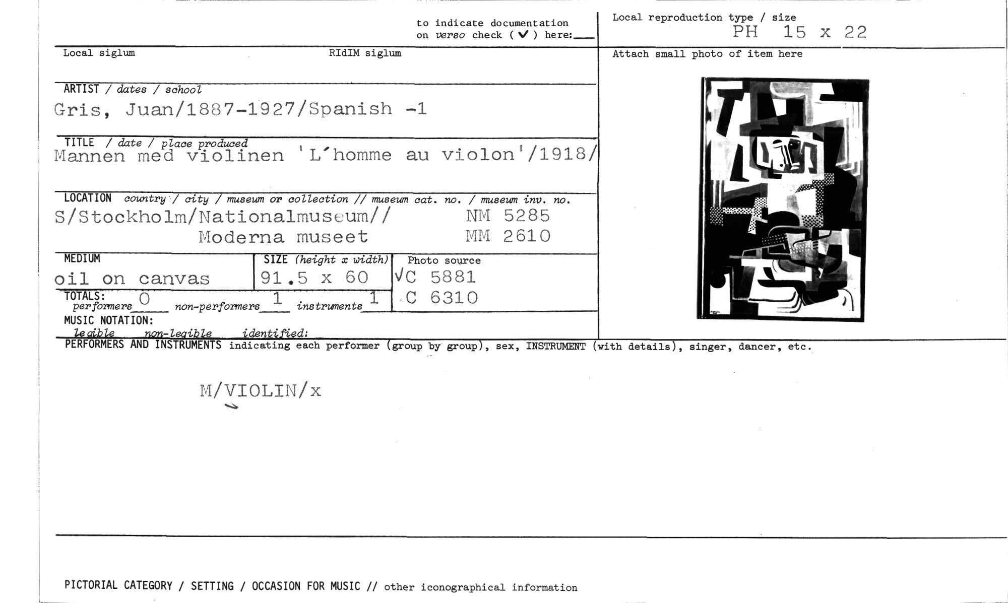 //// to indicate documentation on verso check (V ) here: //// Local reproduction type / size //// PH 15 x 22 //// Local siglum RIdIM siglum //// Attach small photo of item here //// ARTIST / dates / school //// Gris, Juan/1887-1927/Spanish -1 //// TITLE / date / place produced //// Mannen med violinen L'homme au violon /1918/ //// LOCATION country / city / museum or collection // museum cat. no. / museum tnv. no. //// S/Stockholm/Nationalmuseum// NM 5285 //// Moderna museet MM 2610 //// MEDIUM //// oil on canvas //// MUSIC NOTATION: //// levible non-leaible identified: //// PERFORMERS AND INSTRUMENTS indicating each performer (group by group), sex, INSTRUMENT //// M/VIOLIN/x //// TÖTALS: //// per formers () non-performers 1 instruments 1 //// SIZE (height x width) //// 91.5 x 60 //// Photo source //// 4C 5881 C 6310 //// (with details), singer, dancer, etc. //// PICTORIAL CATEGORY / SETTING / OCCASION FOR MUSIC // other iconographical information ////