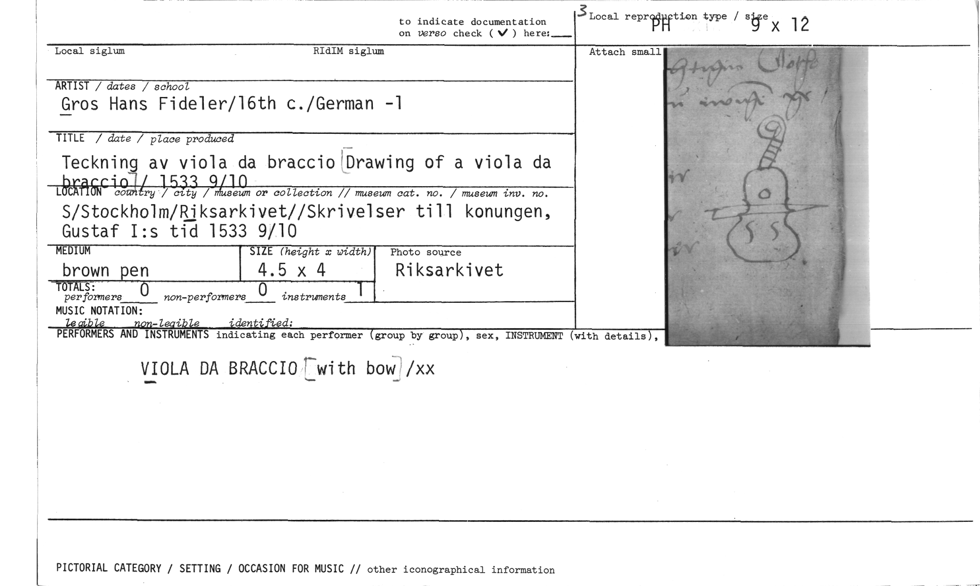 //// to indicate documentation on verso check ( ) here: //// Local reprtftion type / sex 12 //// Local siglum RIdIM siglum //// TITLE / date / place produced //// Teckning av viola da braccio'Drawing of a viola da //// LbP1R1Rmiry Y;cA3 /Useum or collection // museum cat. no. / museum inv. no. //// S/Stockholm/Riksarkivet//Skrivelser till konungen, Gustaf I:s tid 1533 9/10 //// MEDIUM //// 4.5 x 4 //// TÖTALS: //// per formers non-performers instruments //// MUSIC NOTATION: //// non-leaible //// PERFORMERS AND INSTRUMENTS indicating each performer (group by group), sex, INSTRUMENT //// VIOLA DA BRACCI07-with bow /xx //// ARTIST / dates / school //// Gros Hans Fideler/16th c./German -1 //// brown pen //// SIZE (height x width) //// Photo source //// Riksarkivet //// Attach //// (with details), //// PICTORIAL CATEGORY / SETTING / OCCASION FOR MUSIC // other iconographical information ////