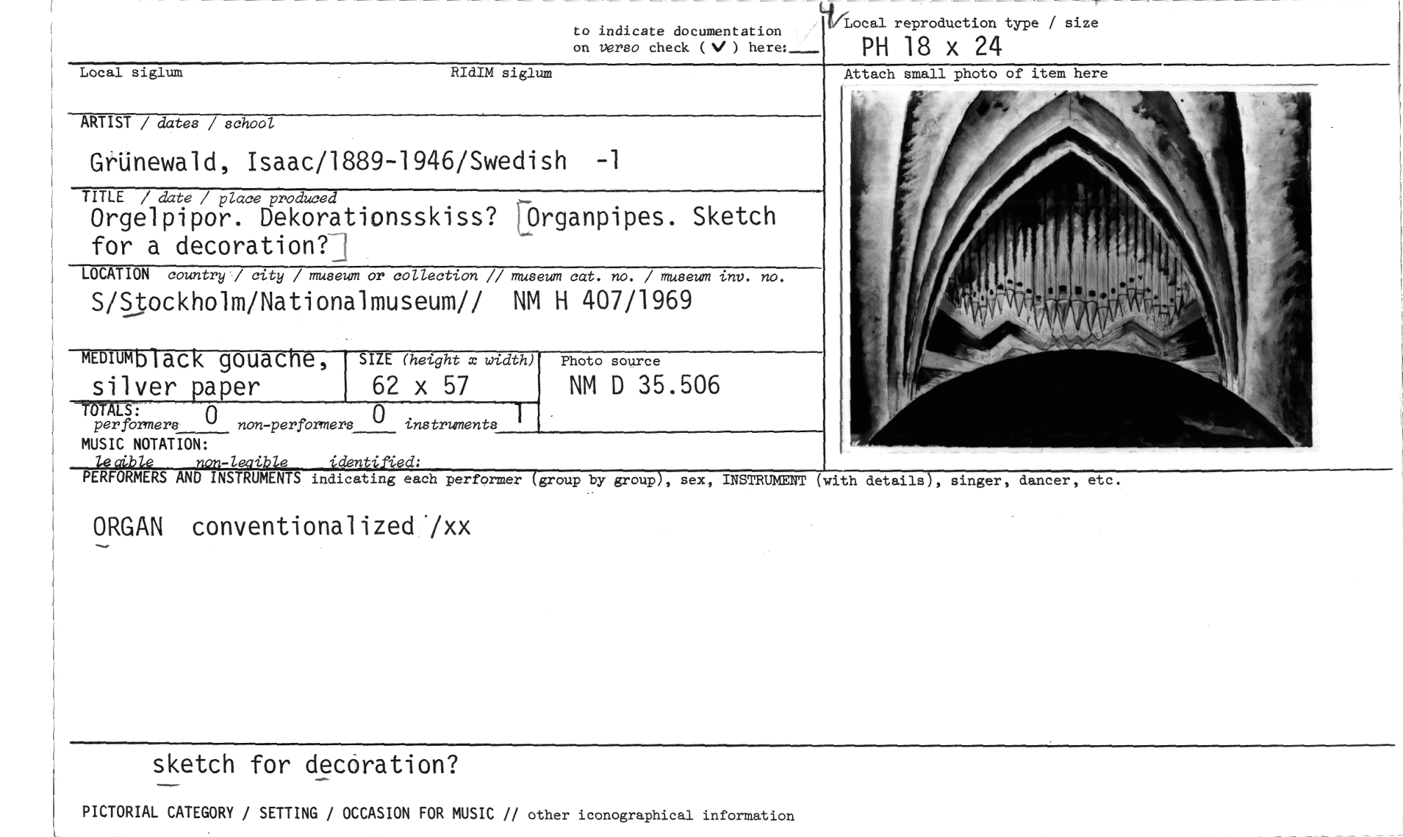 //// ORGAN conventionalized /xx //// sketch for decoration? //// PICTORIAL CATEGORY / SETTING / OCCASION FOR MUSIC // other iconographical information //// to indicate documentation //// on verso check (N/ ) here: //// Lt/Local reproduction type / size //// PH 18 x 24 //// Local siglum RIdIM siglum //// ARTIST / dater / school //// GrUnewald, Isaac/1889-1946/Swedish -1 //// TITLE / date / place produced //// Orgelpipor. Dekorationsskiss? [Organpipen. Sketch for a decoration?1 //// LOCATION country / city / museum or collection // museum cat. no. / museum inv. no. //// S/Stockholm/Nationalmuseum// NM H 407/1969 //// MEDIUMb iack gouache, SIZE (height x width) //// silver paper 62 x 57 //// MALS: //// per formers 0non-performers O instruments 1 //// MUSIC NOTATION: //// non-leaible identified: //// --PERFORMERS AND INSTRUMENTS indicating each pertormer (group by group), sex, INSTRUMENT //// Photo source //// NM D 35.506 //// (with details), singer, dancer, etc. ////