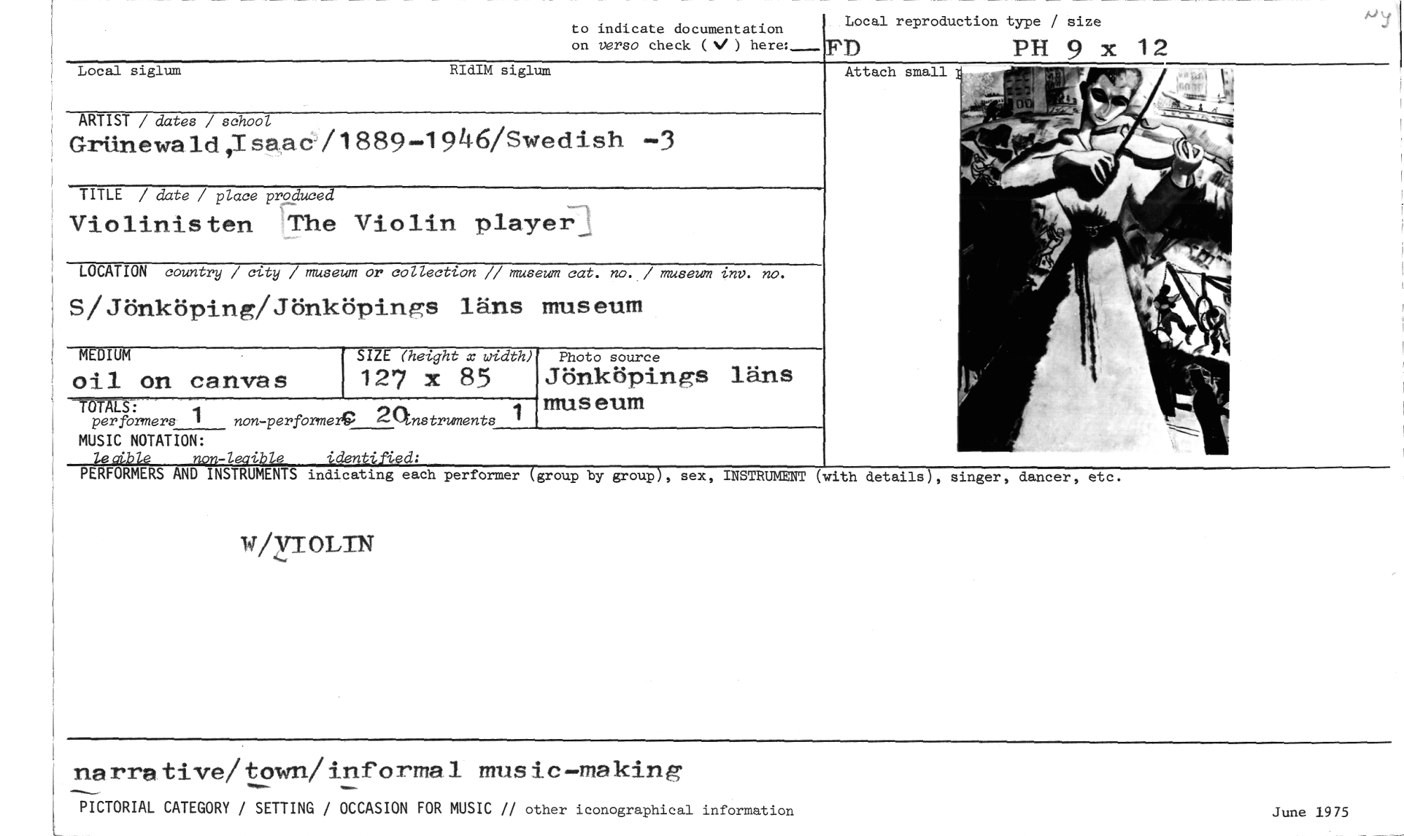 //// to indicate documentation //// on verso check (%/ ) here:- //// 12 //// Local reproduction type / size //// FD PH 9 x //// Local siglum RIdIM siglum //// Attach small //// ARTIST / dates / school //// Grlinewa ld I sa a c- /1889 -1946/Sved ish -3 //// TITLE / date / place produced //// Violinisten The Violin player_ //// LOCATION country / city / museum or collection // museum cat. no. / museum inv. no. //// S/Jönköping/Jönköpings läns museum //// MEDIUM //// oil on canvas //// SIZE (hetght x width) //// 127 x 85 //// TOTALS: //// performers 1 non-performerG 2(tnstruments //// MUSIC NOTATION: //// non-legible identified: //// PERFORMERS AND INSTRUMENTS //// Photo source //// Jönköpings läns museum //// 1 //// indicating each performer //// (group by group), sex, //// INSTRUMENT (with details), singer, dancer, etc. //// w/yroLTN //// June 1975 //// PICTORIAL CATEGORY / SETTING / OCCASION FOR MUSIC // other iconographical information //// narrative/town/informal music-making ////