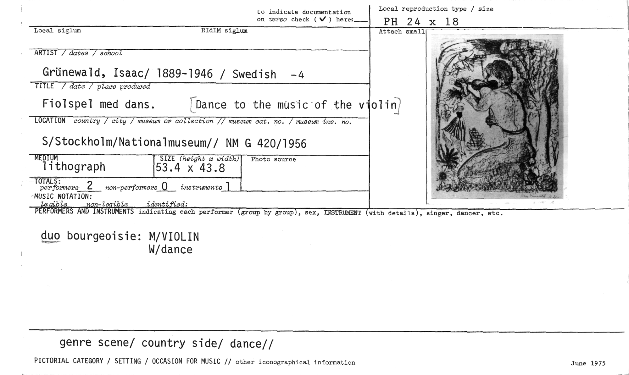 //// to indicate documentation //// on verso check ( ) here:— //// Local reproduction type / size //// PH 24 x 18 //// Attach small //// Local siglum RIdIM siglum //// ARTIST / dater / school //// GrUnewald, Isaac/ 1889-1946 / Swedish - //// TITLE / date / place produced //// Fiolspel med dans. TDance to the mUsic'of the violin! //// LOCATION country / city / museum or collection // museum cat. no. / museum inv. no. //// S/Stockholm/Nationalmuseum// NM G 420/1956 //// MEDIUM //// lithograph //// Photo source //// t77SE—;:; //// per formers non-perfbrmera___ instruments 1 //// MUSIC NOTATION: //// 4eolibie non-leaible identilUd: //// PERFORMERS AND INSTRUMENTS indicating each performer (group by group), sex, INSTRUMENT //// duo bourgeoisie: M/VIOLIN //// W/dance //// (with details), singer, dancer, etc. //// genre scene/ country side/ dance// //// PICTORIAL CATEGORY / SETTING / OCCASION FOR MUSIC // other iconographical information June 1975 ////