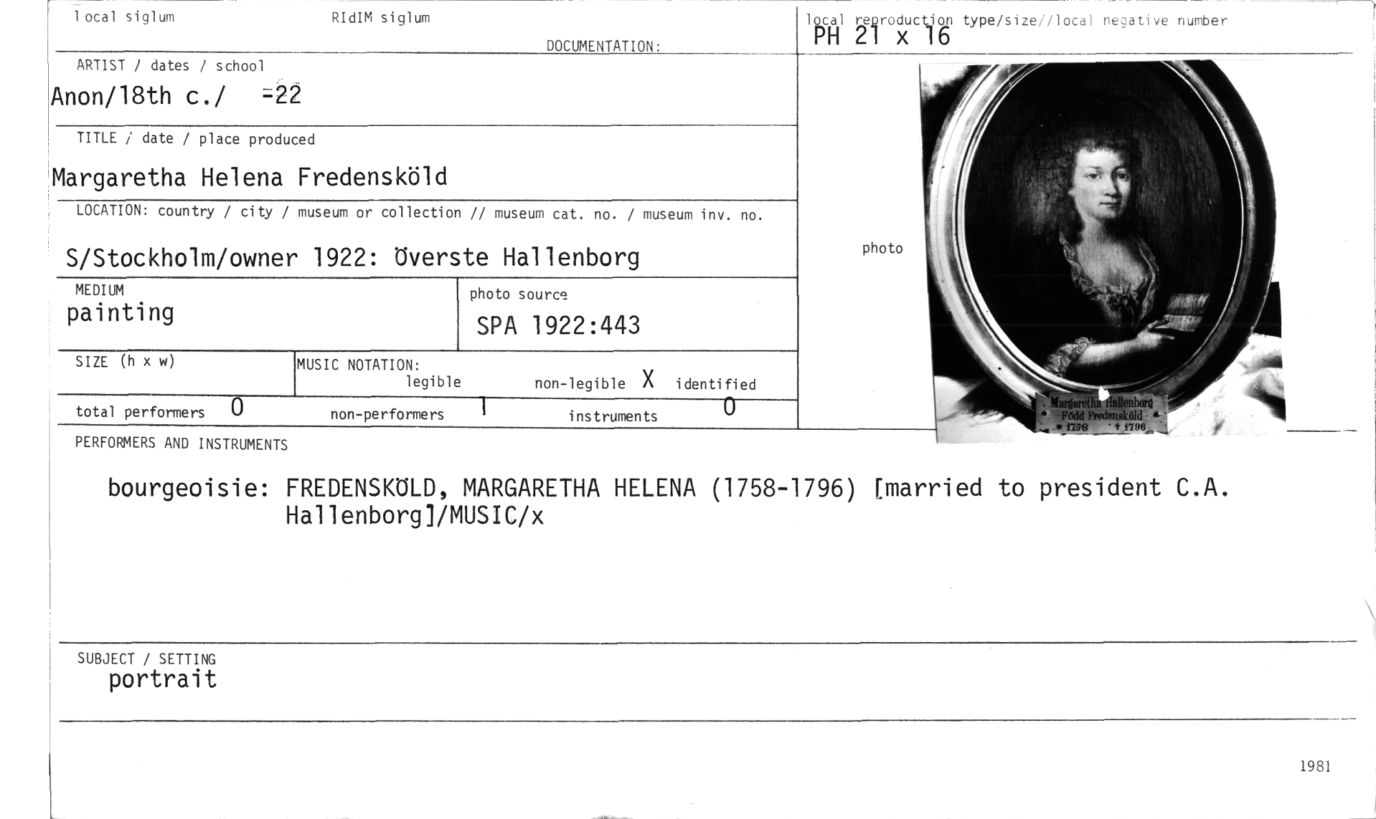 //// lotal siglum RIdIM siglum //// 1 cal reproductjon tYPe/Size//local negative nutuber //// PP //// H 21 x 16 //// DOCUMENTATION: //// ARTIST / dates / school //// Anon/18th c./ =22 //// TITLE / date / place produced //// Margaretha Helena Fredensköld //// LOCATION: country / city / museum or collection // museum cat. no. / museum inv. no. //// S/Stockholm/owner 1922: Överste Hallenborg //// photo //// photo source //// SPA 1922:443 //// MEDIUM //// painting //// MUSIC NOTATION: //// legible non-legible X identified //// SIZE (h x w //// total performers 0 //// non-performers instruments //// PERFORMERS AND INSTRUMENTS //// bourgeoisie: FREDENSKÖLD, MARGARETHA HELENA (1758-1796) [married to president C.A. Hallenborg]/MUSIC/x //// SUBJECT / SETTING //// portrait //// 1981 ////