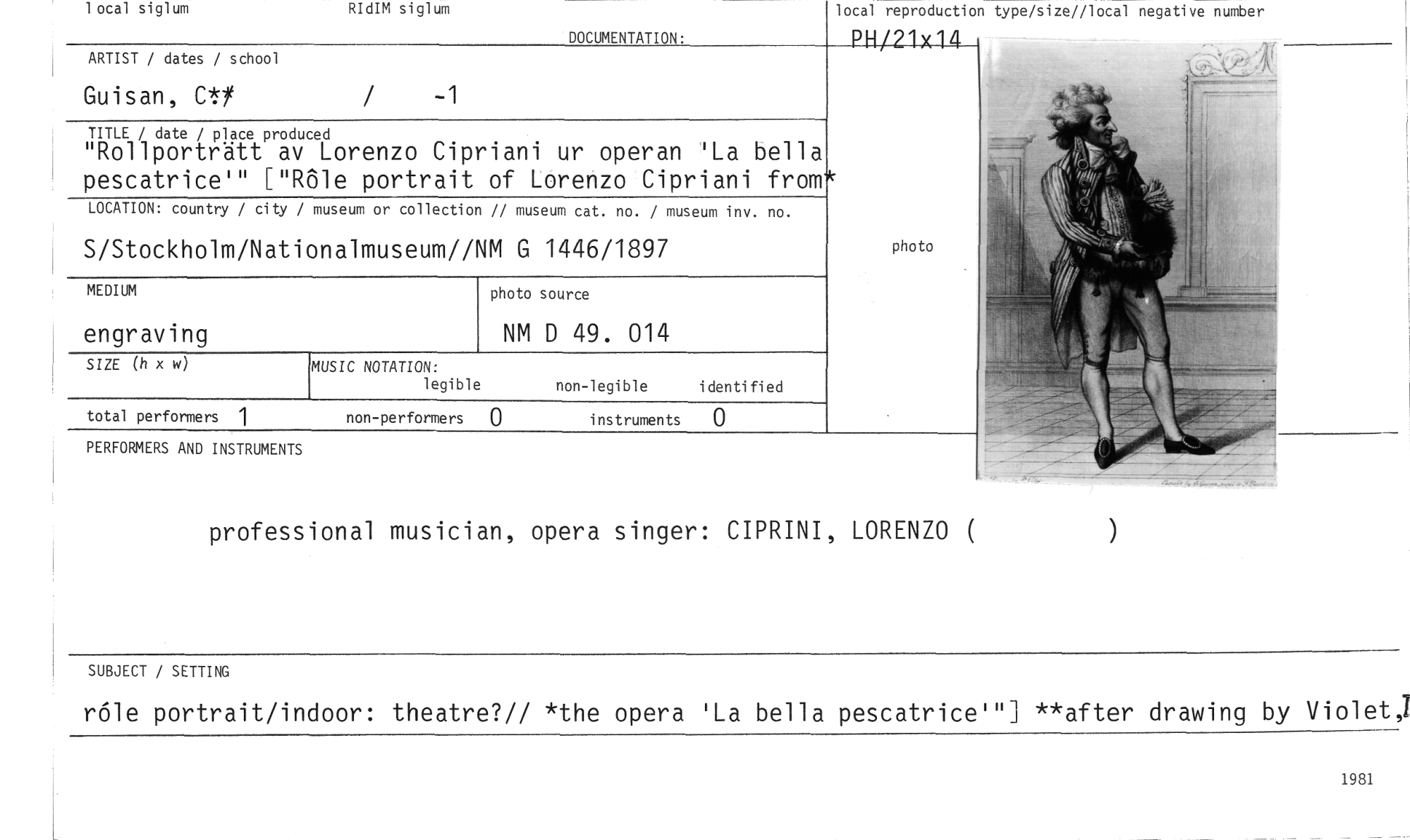 //// professional musician, opera singer: CIPRINI, LORENZO //// SUBJECT / SETTING //// röle portrait/indoor: theatre?// *the opera 'La bella pescatrice"i **after drawing by Violetj //// total performers //// non-performers 0 instruments 0 //// local reproduction type/size//local negative number //// PH/21x14 //// TITLE / date / place produced //// "Rollporträtt av Lorenzo Cipriani ur operan 1La bella pescatrice" ["Röle portrait of Lorenzo Cipriani from* //// LOCATION: country / city / museum or collection // museum cat. no. / museum inv. no. //// S/Stockholm/Nationalmuseum//NM G 1446/1897 //// photo //// SIZE (h x w) //// MUSIC NOTATION: //// legible non-legible identified //// PERFORMERS AND INSTRUMENTS //// MEDIUM //// engraving //// photo source //// NM D 49. 014 //// 1 ocal siglum RIdIM siglum //// DOCUMENTATION: //// ARTIST / dates / school //// Guisan, Ctf / -1 //// 1981 ////