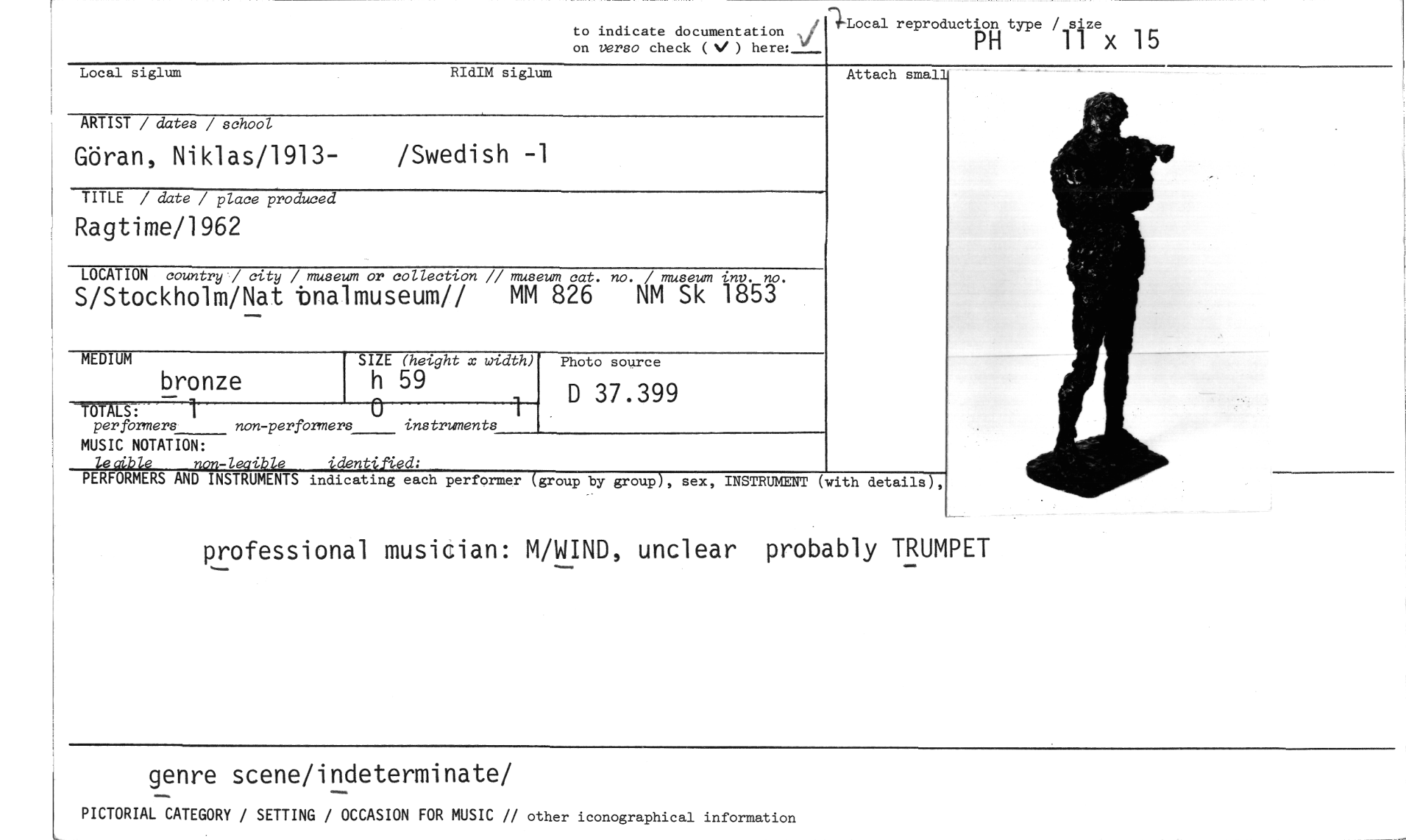 //// to indicate documentation on verso check ( ) here:2f_ //// ';Local reproduction type / size //// PH 11 x 15 //// Local siglum RIdIM siglum //// ARTIST / dates / school //// Göran, Niklas/1913- /Swedish -1 //// TITLE / date / place produced //// Ragtime/1962 //// LOCATION country / city / museum or collection museum ca t. no. / museum in v. no. //// S/Stockholm/Nat analmuseum// MM 826 NM Sk 1853 //// MEDIUM //// b--ronze //// TOTALS: 1 //// perfbrmers non-perfbrmers instruments //// MUSIC NOTATION: //// leaible non-leaible //// PERFORMERS AND INSTRUMENTS //// SIZE (height x width) //// h 59 //// Photo source //// D 37.399 //// identifded: //// Attach small //// indicating each performer (group by group), sex, INSTRUMENT (with details), //// professional musician: M/WIND, unclear probably TRUMPET //// genre scene/indeterminate/ //// PICTORIAL CATEGORY / SETTING / OCCASION FOR MUSIC // other iconographical information ////