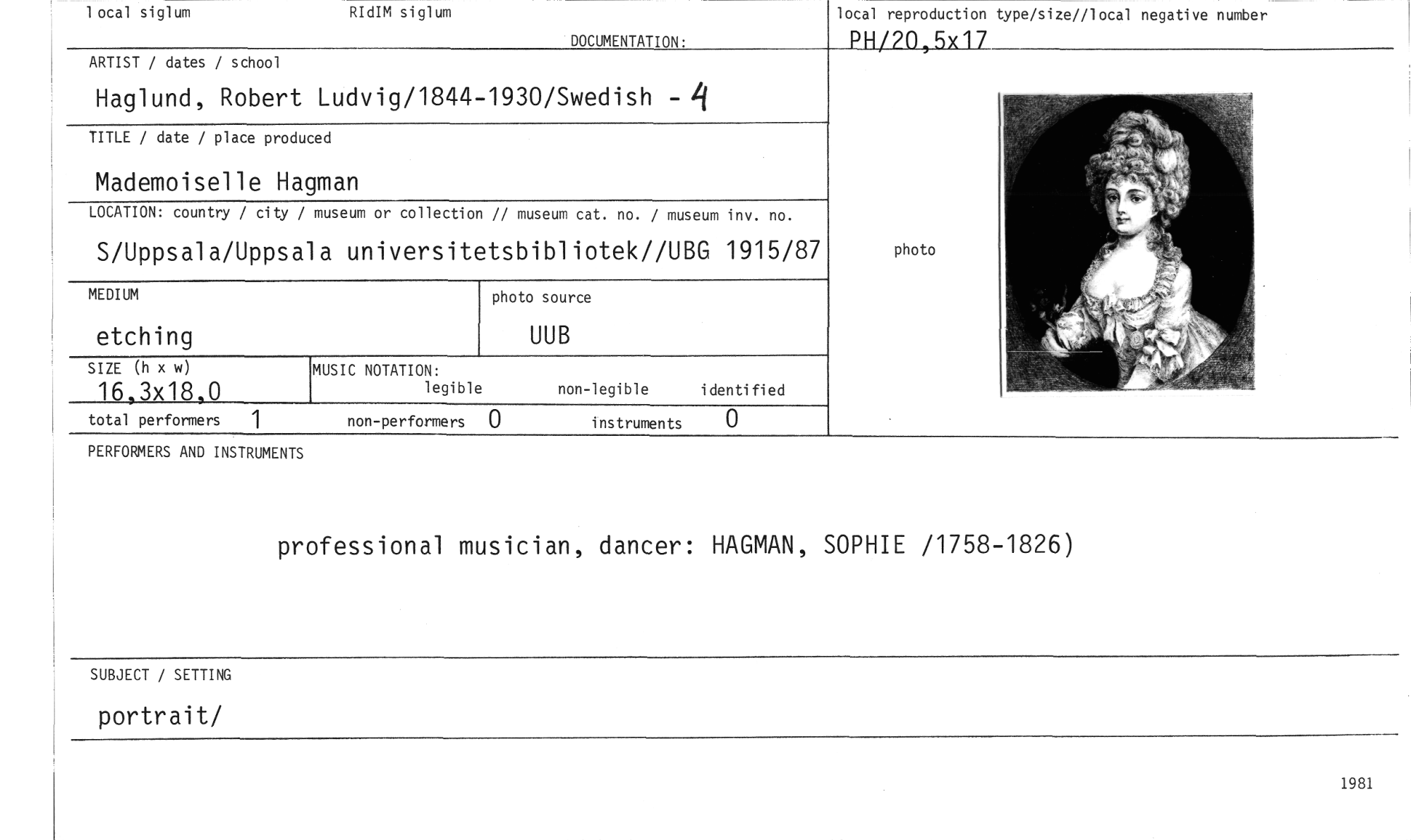 //// local siglum RIdIM siglum //// DOCUMENTATION. //// local reproduction type/size//local negative number //// PH/20,5x17 //// ARTIST / dates / school //// Haglund, Robert Ludvig/1844-1930/Swedish - //// TITLE / date / place produced //// Mademoiselle Hagman //// LOCATION: country / city / museum or collection // museum cat. no. / museum inv. no. //// S/Uppsala/Uppsala universitetsbibliotek//UBG 1915/87 //// MEDIUM //// UUB //// MUSIC NOTATION: //// legible non-legible identified //// total performers 1 non-performers 0 instruments 0 //// SIZE (h x w) //// 16,3x18,0 //// etching //// photo source //// photo //// PERFORMERS AND INSTRUMENTS //// professional musician, dancer: HAGMAN, SOPHIE /1758-1826) //// SUBJECT / SETTING //// portrait/ //// 1981 ////