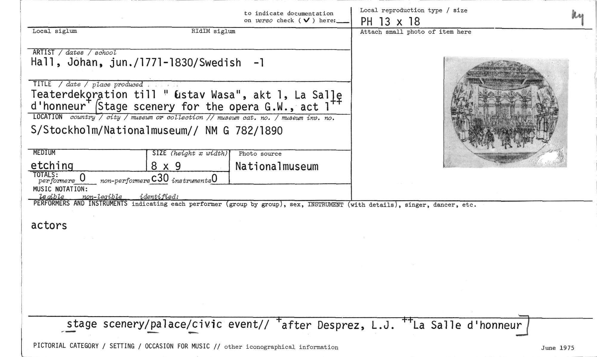 //// to indicate documentation //// on verso check (V ) here:_ //// Local reproduction type / size //// PH 13 x 18 //// Local siglum RIdIM siglum //// ARTIST / dates / school //// Hall, Johan, jun./1771-1830/Swedish -1 //// TITLE / date / place produced //// Teaterdek?ration till " Enstav Wasa", akt 1, La Sal 14 d'honneur stage scenery for the opera G.W., act 1 //// LOCATION country / city / museum or collection // museum cat. no. / museum inv. no. //// S/Stockholm/Nationalmuseum// NM G 782/1890 //// MEDIUM //// etchinq //// Attach small photo of item here //// 8 x 9 //// SIZE (height x width) //// Nationalmuseum //// Photo source //// -MALS: //// per formers 0 //// MUSIC NOTATION: //// lecible non-leaible identified: //// PERFORMERS AND INSTRUMENTS indicating each performer (group by group), sex, INSTRUMENT (with details), singer, dancer, etc. //// actors //// non-per formers c30 instryments0 //// stage scenery/palace/civic event// safter Desprez, L.J. "La Salle d'honneur //// PICTORIAL CATEGORY / SETTING / OCCASION FOR MUSIC // other iconographical information June 1975 ////