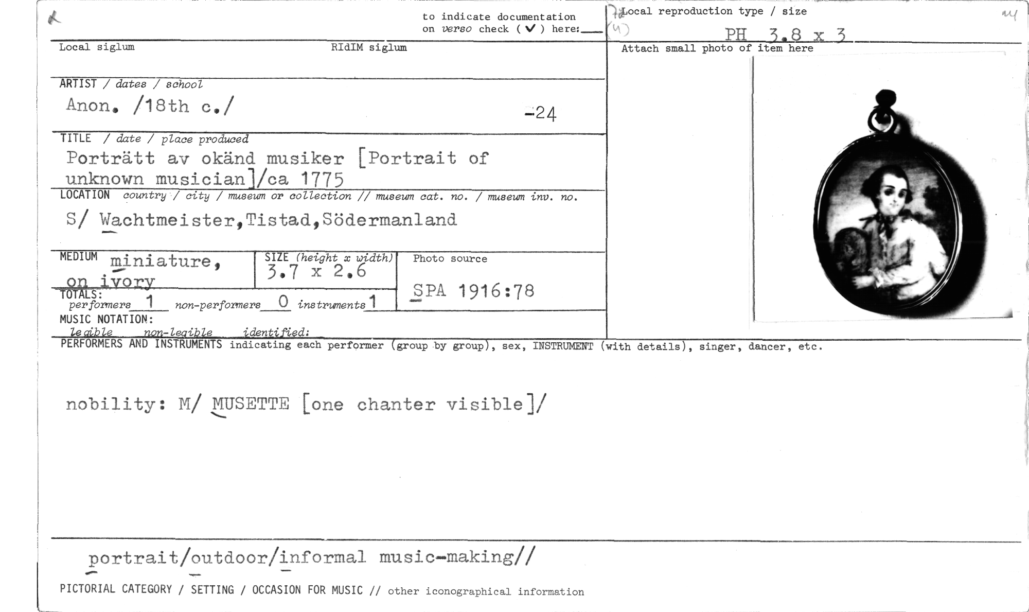 //// to indicate documentation on versa check (V ) //// Local siglum RIdIM siglum -)ipocal reproduction type / size //// PH 3.8 x 3 //// Attach small photo of item here //// ARTIST / dates / school //// Anon. /18th c./ -24 //// TITLE / date / place produced //// Porträtt av okänd musiker [Portrait of //// unknown musicianl/ca 1775 //// LOCATION country / city / museum or collection // museum cat. no. / museum inv. no. //// S/ Wachtmeister,Tistad,Södermanland //// SIZE (height x width) //// 3.7 x 2.6 //// non-perfOrmers 0 instruments 1 //// MUSIC NOTATION: //// non-leaible identified: //// PERFORMERS AND INSTRUMENTS indicating each performer (group by group), sex, //// nobility: M/ MUSETTE [one chanter visible]/ //// portrait/outdoor/informal music—making// //// PICTORIAL CATEGORY / SETTING / OCCASION FOR MUSIC // other iconographical information //// MEDIUM miniature, //// -- //// on ivory //// per formers 1 //// Photo source //// SPA 1916:78 //// INSTRUMENT (with details), singer, dancer, etc. ////