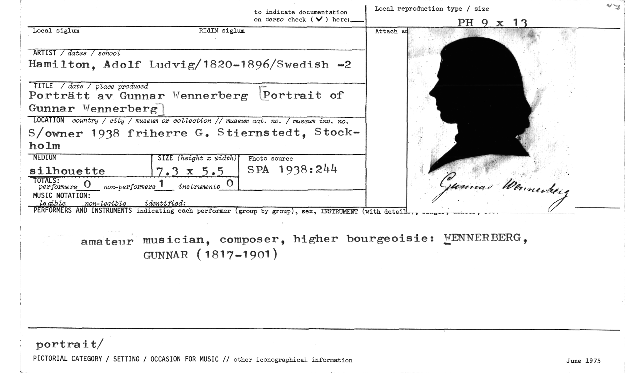//// to indicate documentation on verso check ( ) //// Local reproduction type / size //// PH 9 x //// 13 //// Local siglum RIdIM siglum //// ARTIST / dates / school //// Hamilton, Adolf Ludvig/1820-1896/Swedish -2 //// TITLE / date / place produced //// Porträtt av Gunnar vennerberg Yortrait of Gunnar iNTennerbere //// LOCATION country / city / museum or collection // museum cat. no. / museum unv. no. //// S/owner 1938 friherre G. Stiernstedt, Stockholm //// MEDIUM SIE (height x width) Photo source //// silhouette .3 x 5.5 SPA 1938:244 //// formers C1 non-performers 1 instruments //// MUSIC NOTATION: //// leaible _non-leaible identified: //// PERFORMERS AND INSTRUMENTS indicating each performer (group by group), sex, INSTRUMENT (with detail-„ ___o__, ___, //// amateur musician, composer, higher bourgeoisie: YENNERBERG, GUNNAR (1817-1901) //// Attach sr //// portra i t/ //// PICTORIAL CATEGORY / SETTING / OCCASION FOR MUSIC // other iconographical information //// June 1975 ////