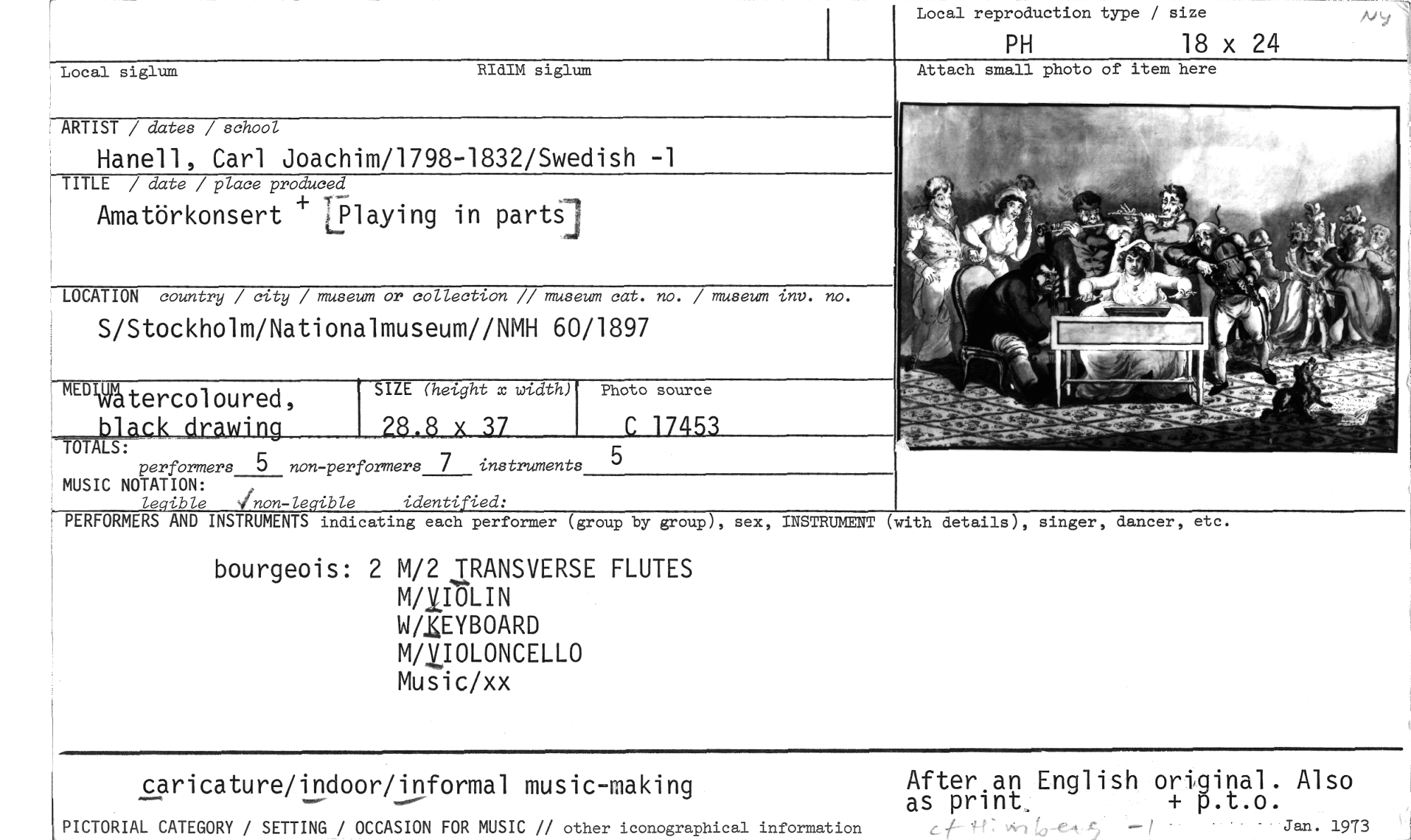 //// PERFORMERS AND INSTRUMENTS indicating each performer (group by group), sex, INSTRUMENT //// (with //// details), //// etc. //// singer, dancer, //// Local siglum RIUM siglum //// ARTIST / dates / school //// Hanell, Carl Joachim/1798-1832/Swedish -1 //// TITLE / date / place produced //// Amatörkonsert IPlaying in parts] //// Local reproduction type / size //// PH 18 x 24 //// Attach small photo of item here //// LOCATION country / city / museum or collection // museum cat. no. / museum inv. no. //// S/Stockholm/Nationalmuseum//NMH 60/1897 //// Photo source //// --1"-öfkla //// performers 5 non-performers 7 instruments //// MUSIC NOTATION: , //// legible yinon-legible identified: //// bourgeois: 2 M/2 TRANSVERSE FLUTES //// MdfULIN //// WAKEYBOARD M/VOLONCELLO //// Music/xx //// Hrgåtercoloured, ck draming //// SIZE (height x width) //// 28.8 x 37 //// C 17453 //// 5 //// After an English original. Also as print + p.t.o. //// i - Jan. 1973 //// caricature/indoor/informal music-making //// PICTORIAL CATEGORY / SETTING / OCCASION FOR MUSIC // other iconographical information //// ////