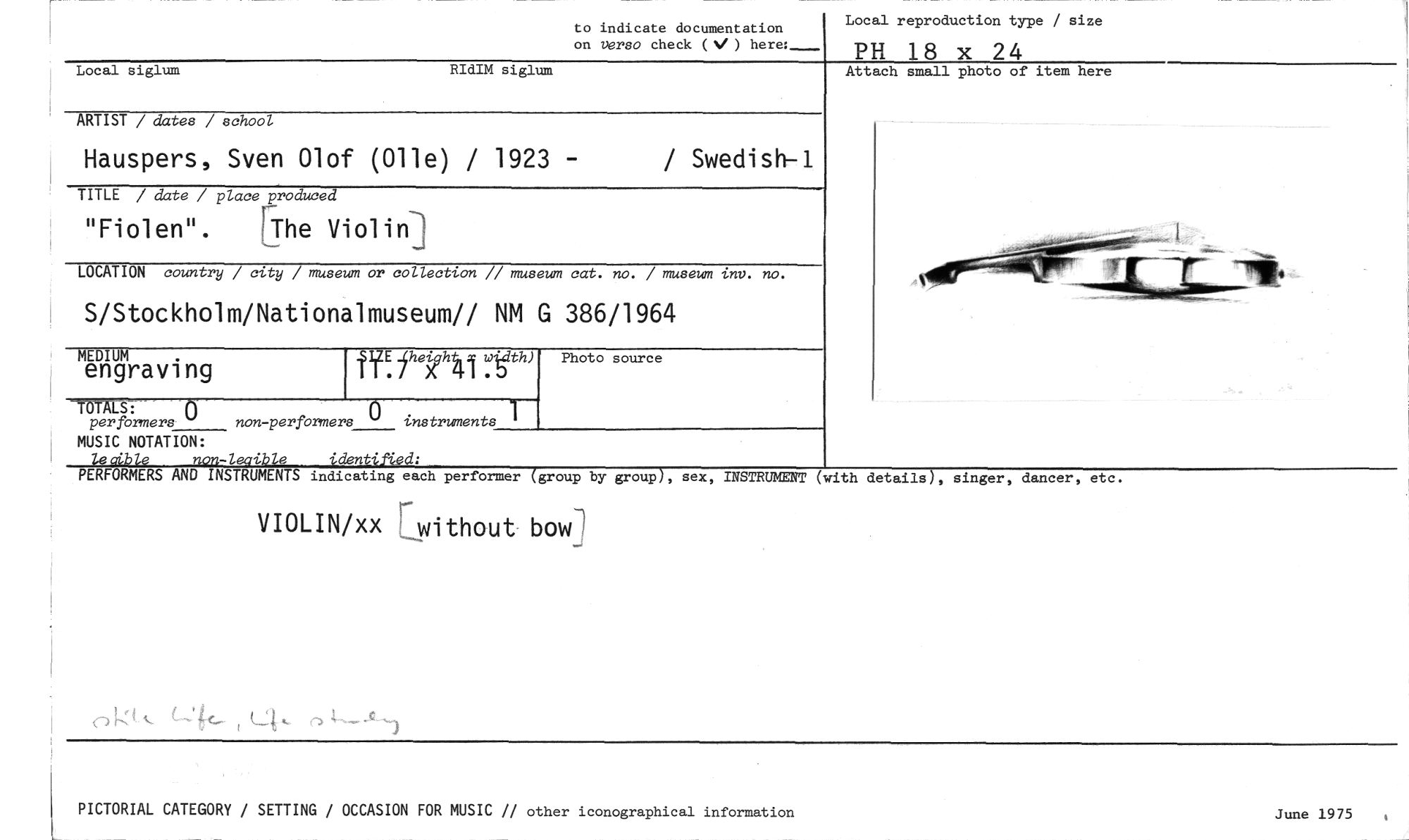 //// to indicate documentation //// on verso check (4/ ) here:_ //// Local reproduction type / size //// PH 18 x 24 //// Local siglum RIdIM siglum //// ARTIST / dates / school //// Hauspers, Sven Olof (011e) / 1923 - / Swedish-1 //// TITLE / date / place produced //// "Fiolen". i r- //// The Violin //// LOCATION country / city / museum or collection // museum cat. no. / museum inv. no. //// S/Stockholm/Nationalmuseum// NM G 386/1964 //// MEDIUM //// engraving //// yE jhekozh rdth) //// Photo source //// Attach small photo of item here //// T T LS: //// per formers non-performers //// instruments //// group by group , sex, INSTRUMENT (with details singer, dancer, et //// MUSIC NOTATION: //// •ft, 4,- /-, i. e 'lent' d: //// PERFORMERS AND INSTRUMENTS indicating each performer //// VIOLIN/xx without bowl //// PICTORIAL CATEGORY / SETTING / OCCASION FOR MUSIC // other iconographical information June 1975 //// ////