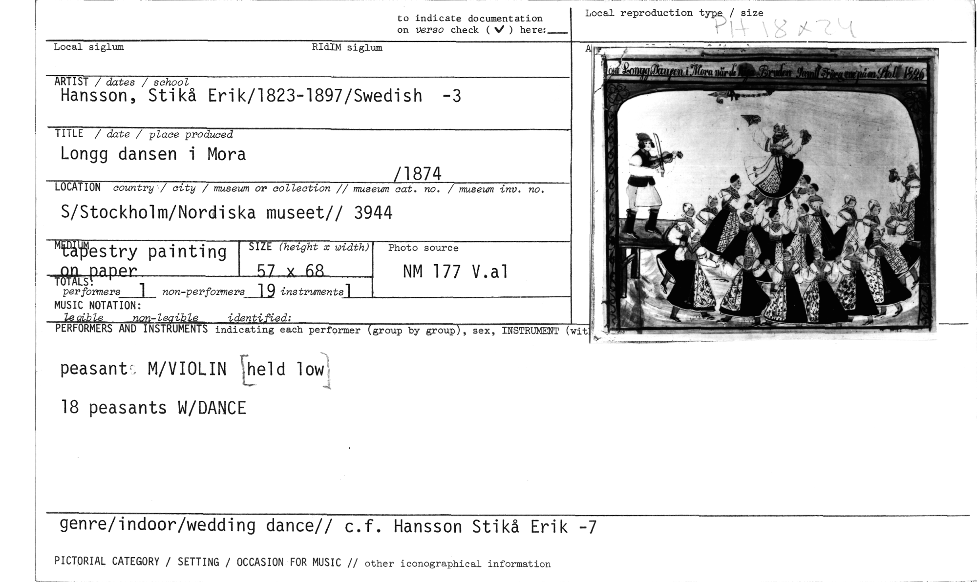 //// peasant:. M/VIOLIN rtheld lowl 18 peasants W/DANCE //// genre/indoor/wedding dance// c.f. Hansson Stikå Erik -7 //// PICTORIAL CATEGORY / SETTING / OCCASION FOR MUSIC // other iconographical information //// fyr:4? //// to indicate documentation on verso check (V ) here: //// Local siglum RIdIM siglum //// ARTIST / dates / school //// Hansson, Stikå Erik/1823-1897/Swedish -3 //// TITLE / date / place produced //// Longg dansen i Mora //// /1874 //// LOCATION country / city / museum or collection // museum cat. no. / museum inv. no. //// S/Stockholm/Nordiska museet// 3944 //// meiVestry painting SIZE (height x width) //// 57 Y 62 //// Te 'IS //// performers_j__ non-performers 19 instrumental //// MUSIC NOTATION: //// non-leaikle identified: //// Local reproduction type / size //// PERFORMERS AND INSTRUMENTS indicating each performer (group by group), sex, INSTRUMENT (wit //// Photo source //// NM 177 V.al ////