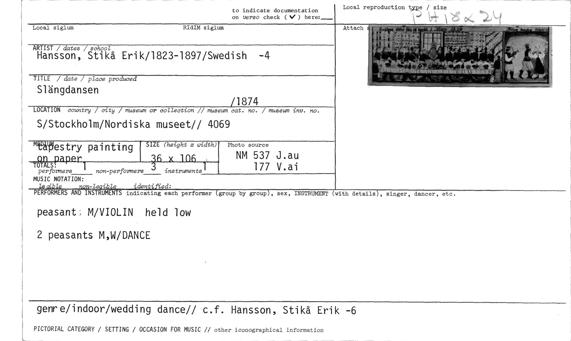 //// to indicate documentation //// on versa check (V ) here:- //// Local reproduction type / size //// Attack //// ARTIST / dates / school //// Hansson, Stikå Erik/1823-1897/Swedish -4 //// TITLE / date / place produced //// Slängdansen //// /1874 //// NM 537 J.au 177 V.ai //// mffitlestry painting SIZE (height x width) //// LOCATION country / city / museum or collection // museum cat. no. / museum inv. no. //// S/Stockholm/Nordiska museet// 4069 //// nn paper //// 1 //// 96 //// performers non-performers instruments' //// MUSIC NOTATION: //// Photo source //// - qi *Ii 1-.1., e .dent 'ed: //// PERFORMERS AND INSTRUMENTS indicating each performer group by group //// , sex, INSTRUMENT (with details), //// dancer, etc. //// singer, //// peasant M/VIOLIN held low //// 2 peasants M,W/DANCE //// genre/indoor/wedding dance// c.f. Hansson, Stikå Erik -6 //// PICTORIAL CATEGORY / SETTING / OCCASION FOR MUSIC // other iconographical information ////