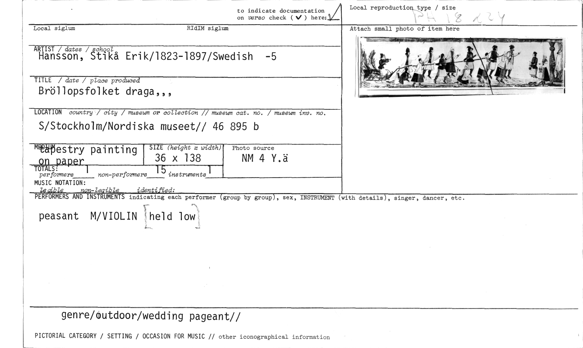 //// to indicate documentation on Immo check ( ) here: //// Local reproduction type / size //// Attach small photo of item here //// Local siglum RIdIM siglum //// ARTIST / dates / schgol //// Hansson, Stikå Erik/1823-1897/Swedish -5 //// TITLE / date / place produced //// Bröllopsfolket draga,,, //// LOCATION country '/ city / museum or collection // museum cat. no. / museum inv. no. //// S/Stockholm/Nordiska museet// 46 895 b //// mtäOestry painting //// Ii 01..0' //// SIZE (height x width) //// 36 x 138 Photo source //// NM 4 Y.ä //// I //// S: //// per formers non-per formers instruments //// MUSIC NOTATION: //// lesible non-leaible identified: //// PERFORMERS AND INSTRUMENTS indicating each performer (group by group), sex, INSTRUMENT (with details), singer, dancer, etc. //// peasant M/VIOLIN 'held low //// genre/outdoor/wedding pageant// //// PICTORIAL CATEGORY / SETTING / OCCASION FOR MUSIC // other iconographical information ////