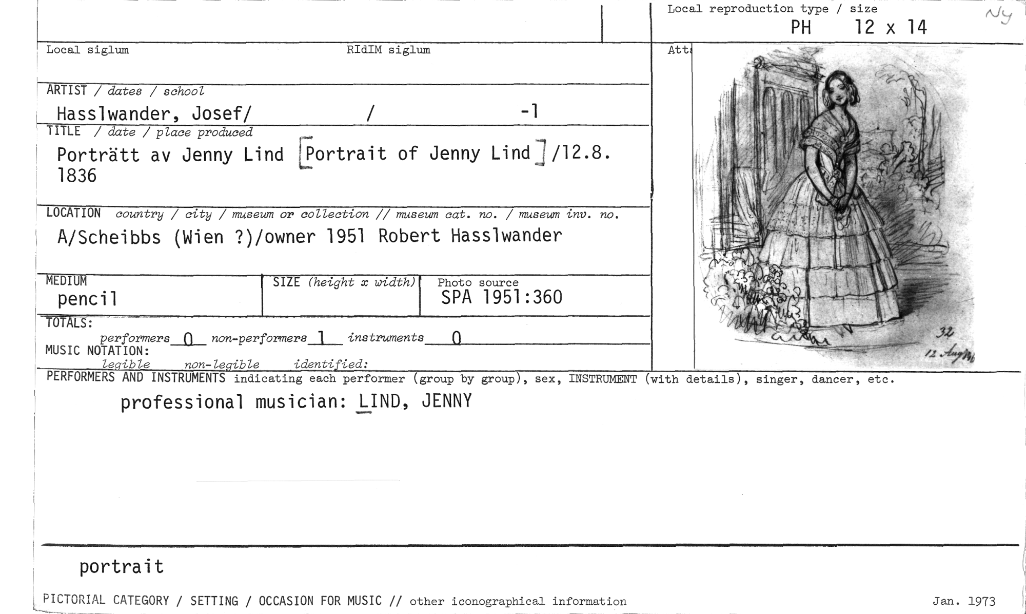 //// MEDIUM //// pencil //// Photo source //// SPA 1951:360 //// SIZE (height x width) //// Local reproduction type / size //// PH 12 x 14 //// , Local siglum RIdIM siglum //// ARTIST / dates / school //// Hasslwander, Josef/ -1 //// TITLE / date / place produced //// Porträtt av Jenny Lind rPortrait of Jenny Lind:1/12.8. 1836 //// LOCATION country / city / museum or collection // museum cat. no. / museum tnv. no. //// A/Scheibbs (Wien ?)/owner 1951 Robert Hasslwander //// INSTRUMENT //// professional musician: LIND, JENNY //// performers non-performers_A___instruments //// MUSIC NOTATION: //// legible non-leqible identified: //// PERFORMERS AND INSTRUMENTS indicating each performer (group by group), sex, //// Att //// ith details), singer, dancer, etc. //// portrait //// LPICTORIAL CATEGORY / SETTING / OCCASION FOR MUSIC // other iconographical information Jan. 1973 ////