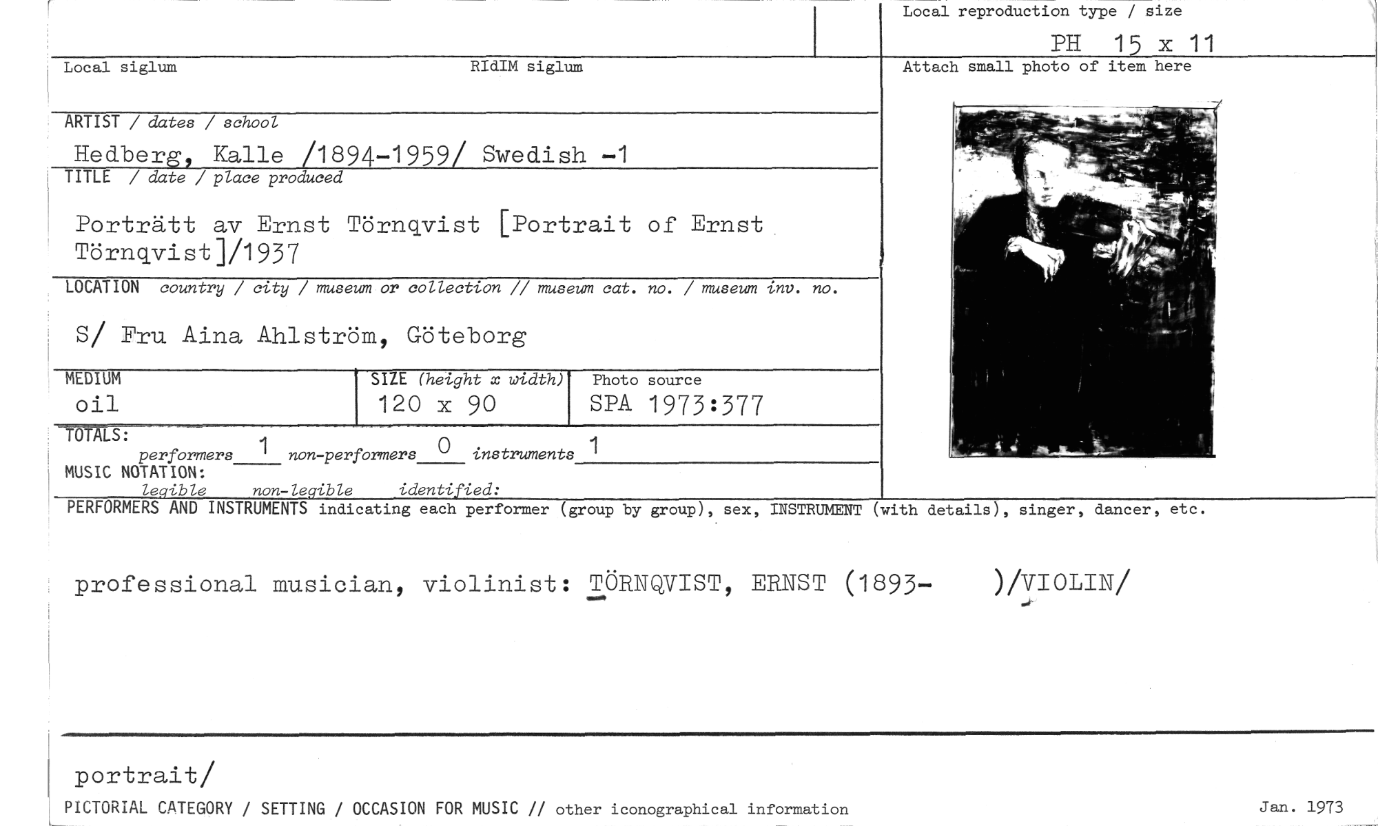 //// Local reproduction type / size //// PH 15 x 11 //// Local siglum RIdIM siglum //// Attach small photo of item here //// ARTIST / dates / school //// Hedberg, Kalle /1894-1959/ Swedish //// TITLE / date / place produced //// Porträtt av Ernst Törnqvist [Portrait of Ernst Törnqvist]/1957 //// LOCATION country / city / museum or collection // museum cat. no. / museum inv. no. //// S/ Fru Aina Åhlström, Göteborg //// SIZE (height x width) Photo source //// 120 x 90 SPÅ 1973:377 //// performers 1 non -perförmers o instruments //// MUSIC NOTATION: //// legible non -Iegible identified: //// PERFORMERS AND INSTRUMENTS indicating each performer (group by group), sex, INSTRUMENT (with details), singer, dancer, etc. //// MEDIUM oil //// professional musician, violinist: TÖRNQVIST, ERNST (1893- )/VIOLIN/ //// portraiti/ //// PICTORIAL CATEGORY / SETTING / OCCASION FOR MUSIC // other iconographical information ////