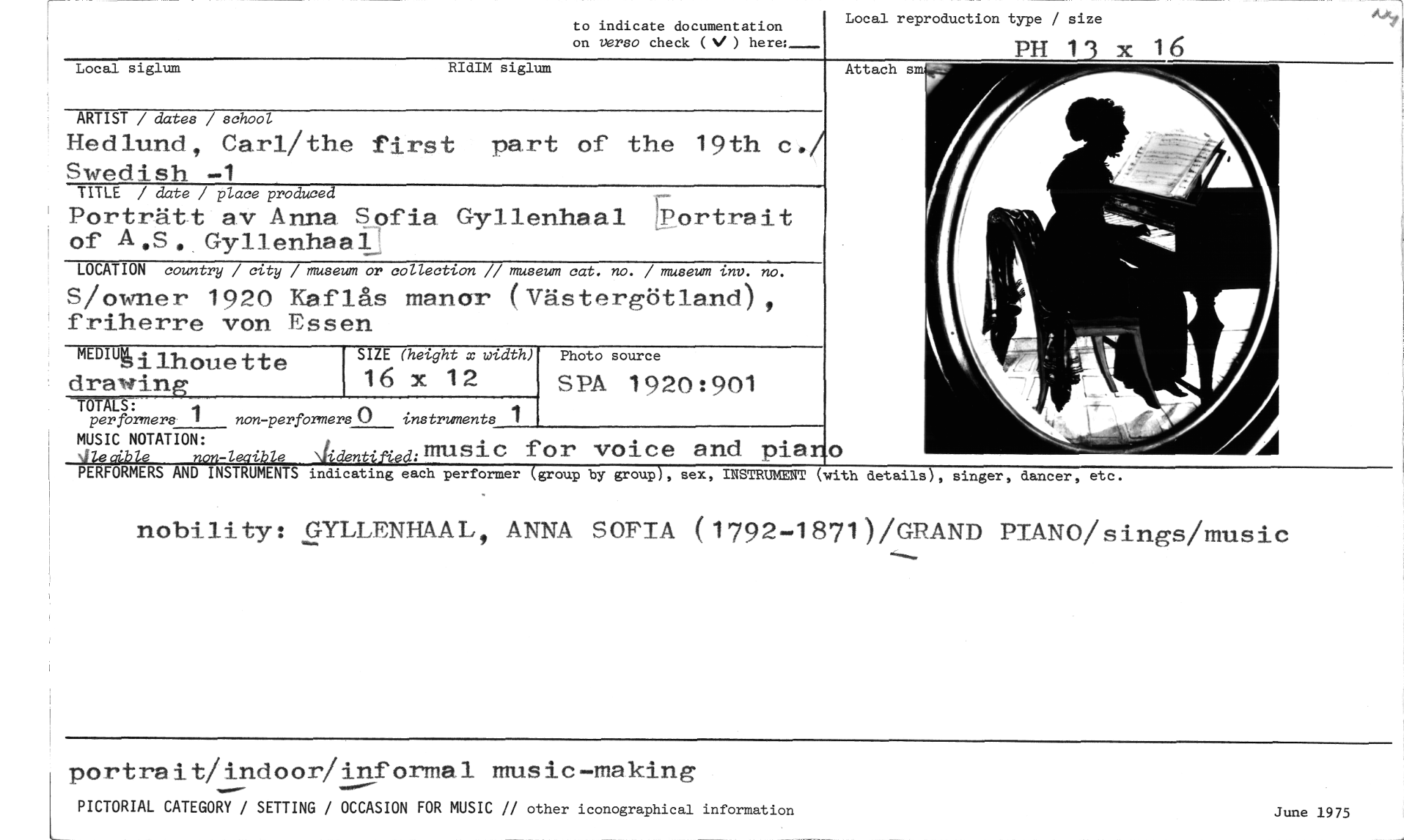 //// to indicate documentation //// on verso check (V ) here:_ //// Local siglum RIdIM siglum //// Local reproduction type / size //// PH 1'3 x //// Attach sm //// 1 //// ARTIST / dates / school //// Hedlund, Carl/the first part of the 19th e. Swedish -1 //// TITLE / date / place produced //// Porträtt av Anna Sofia. Gyllenhaal of A .S Gyllenhaa 1 //// LOCATION country / city / museum or collection // museum cat. no. / museum inv. no. //// S/owner 1920 Kaflås manar ( Vä.stergötland) 9 friherre von Essen //// mEmuhilhouette drawing SIZE (height x width) //// 16 x 12 //// //// per formers 1 non-perfbrmers() instruments 1 //// MUSIC NOTATION: //// \ilevible non-legible 4idengfied: music f'(>17 -voice //// and no //// PERFORMERS AND INSTRUMENTS indicating each performer (group by group), sex, INSTRUMENT //// Portra i t //// Photo source //// SPA. 1920:901 //// (with details), singer, dancer, etc. //// nobili ty : GYLLF,NHAAL ANNA SOFIA ( 1792-1871 )/GRAND PIANO/ s ings/music //// port ra i t/ indo or/inf orrna 1 /n-usle-making //// PICTORIAL CATEGORY / SETTING / OCCASION FOR MUSIC // other iconographical information //// June 1975 //// ////
