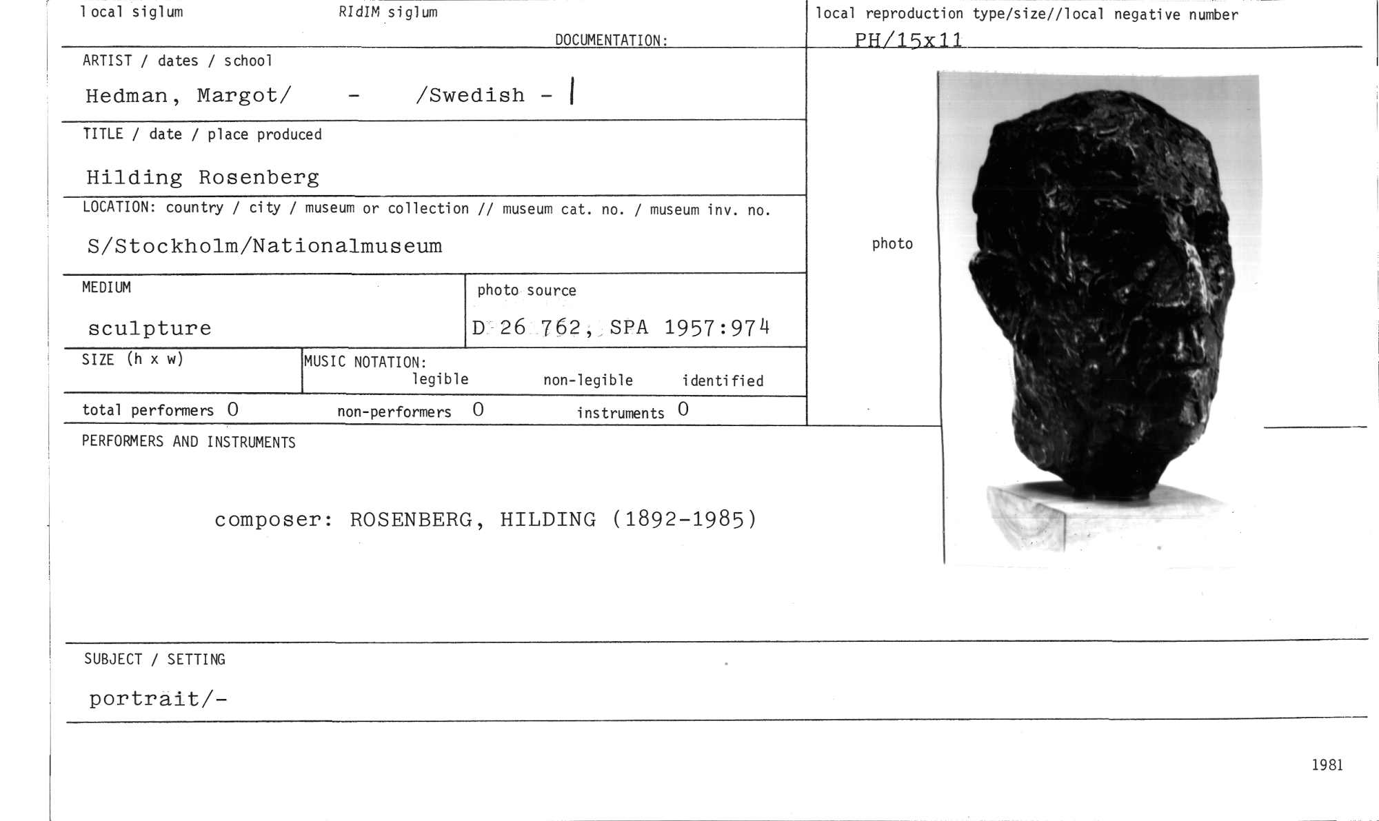 //// 1981 //// non-performers 0 instruments 0 //// total performers 0 //// local siglum RIdIM siglum //// DOCUMENTATION. //// ARTIST / dates / school //// Hedman, Margot/ /Swedish - //// TITLE / date / place produced //// Hilding Rosenberg //// LOCATION: country / city / museum or collection // museum cat. no. / museum inv. no. //// S/Stockholm/Nationalmuseum //// MEDIUM //// sculpture //// SIZE (h x w) //// non-legible identified //// PERFORMERS AND INSTRUMENTS //// composer: ROSENBERG, HILDING (1892-1985) //// MUSIC NOTATION: //// legible //// D 26 762, SPA 1957:974 //// photo source //// photo //// SUBJECT / SETTING //// porträit/- //// local reproduction type/size//local negative number //// PH/15x11 ////
