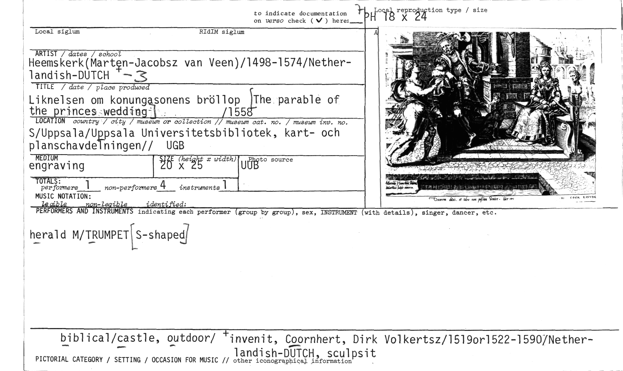 //// to indicate documentation -)-DHLosak repropkuktion type / size on verso check ( ) here:._ Ibb X L //// details), singer, dancer, etc. //// Local siglum RIdIM siglum //// ARTIST / dates / school //// Heemskerk(Martyl-Jacobsz van Veen)/1498-1574/Netherlandish-DUTCH //// TITLE / date / place p oduced //// Liknelsen om konung sonens bröllop )The parable of //// the princes-meddingi , /155 //// LOCATION country / city / museum or collection // museum cat. no. / museum inv. no. //// S/Uppsala/Uppsala Universitetsbibliotek, kart- och planschavdelningen// UGB //// udtto source //// MUSIC NOTATION: //// non-leaible identi.fied; //// PERFORMERS AND INSTRUMENTS indicating each performer (group by group), sex, INSTRUMENT //// herald M/TRUMPETb-shapedi //// MEDIUM g rig x width) //// engraving //// per formers 1 non-perfbrmers 4 instruments 1 //// (with //// biblical/castle, outdoor/ +invenit, Coornhert, Dirk Volkertsz/1519or1522-1590/Nether_ //// landish-DUTCH, sculpsit //// PICTORIAL CATEGORY / SETTING / OCCASION FOR MUSIC 7/ other iconographical information ////