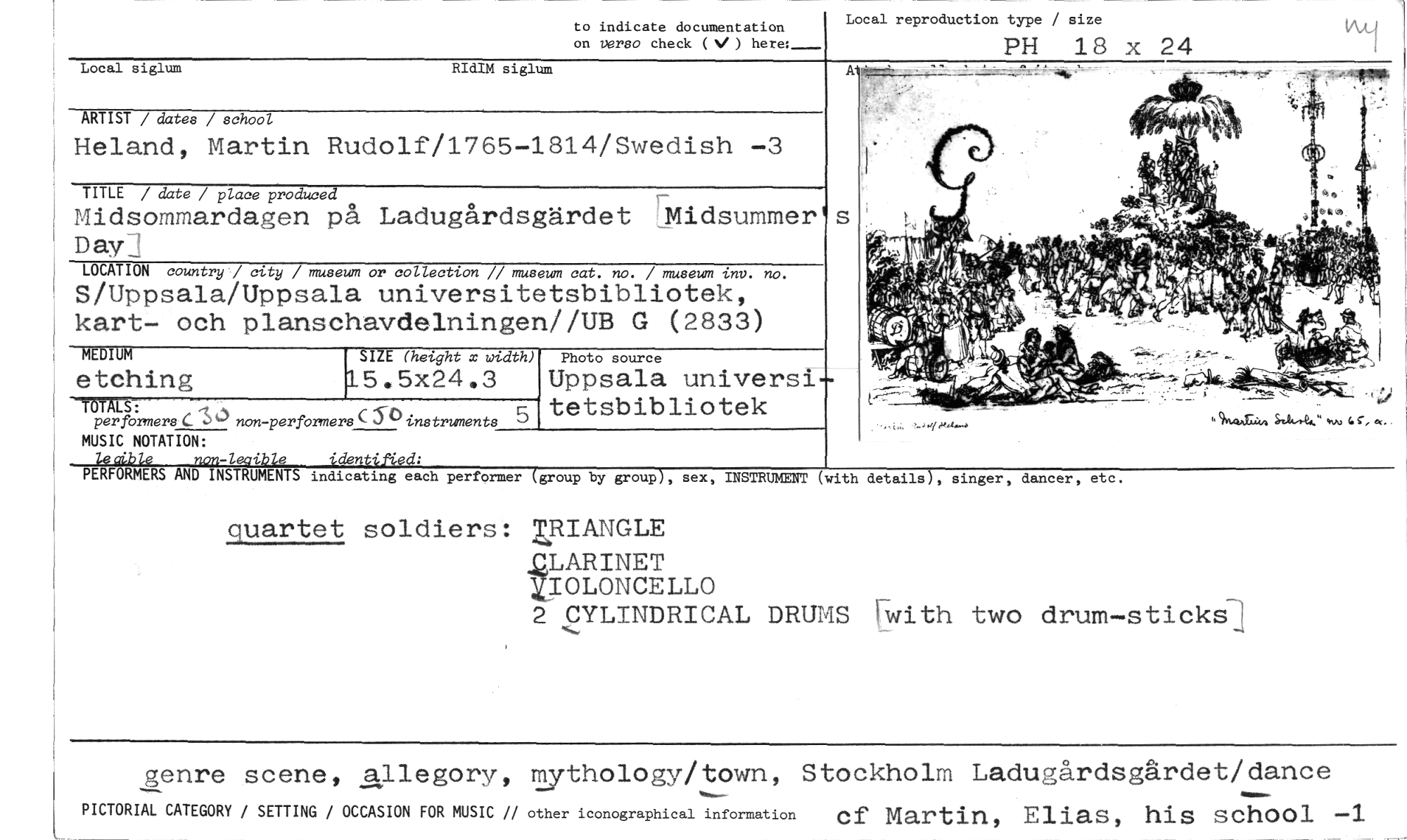 //// to indicate documentation //// on versa check ( ) here:_ //// Local reproduction type / size //// PH 18 x 24 //// Local siglum RIdIM siglum //// ARTIST / dates / school //// Heland, Martin Rudolf/1765-1814/Swedish -3 //// TITLE / date / place produced //// Midsommardagen på Ladugårdsgärdet Midsummer Day2 //// LOCATION country / city / museum or collection // museum cat. no. / museum vnv. no. //// S/Uppsala/Uppsala universitetsbibliotek, kart- och planschavdelningen//UB G (2833) //// MEDIUM //// etching //// —TUM: //// per formers non-perfortners(S° instruments //// MUSIC NOTATION: //// le aib le non-leaible identified: //// PERFORMERS AND INSTRUMENTS indicating each performer (group by group), sex, INSTRUMENT //// (with details), singer, dancer, etc. //// SIZE (height x width) //// 15.5x24.3 //// Photo source //// Uppsala universi tetsbibliotek //// quartet soldiers: ZRIANGLE //// 2LARINET IOLONCELLO 2 CYLINDRICAL DRUMS [with two drum-sticksi //// genre scene, //// allegory, mythology/town, Stockholm Ladugårdsgårdet/dance //// PICTORIAL CATEGORY / SETTING / OCCASION FOR MUSIC // other iconographical information //// cf Martin, Elias, his school -1 ////