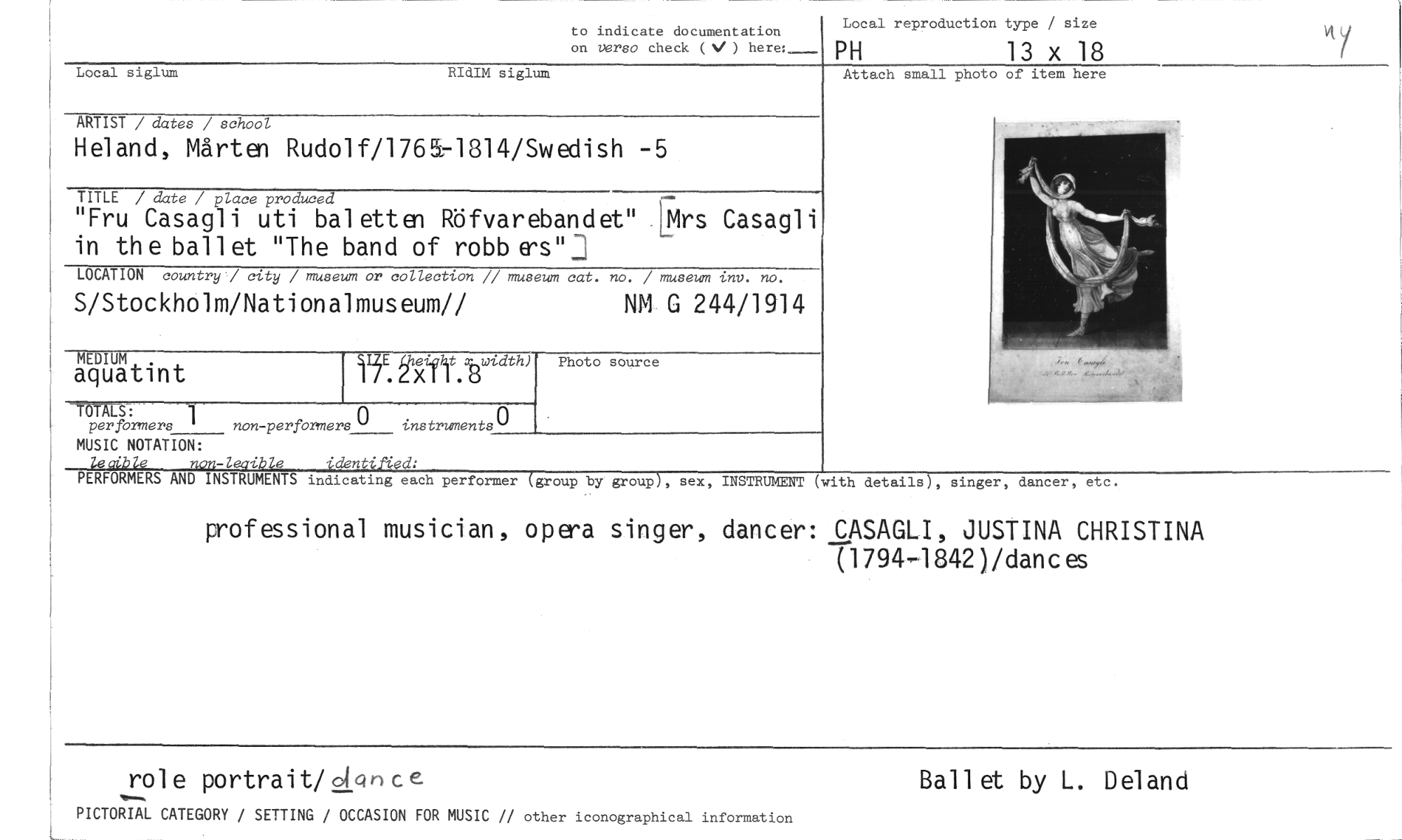 //// to indicate documentation //// on verso check (V ) here:- //// Local reproduction type / size //// PH 13 x 18 //// vt / //// Local siglum RIdIM siglum //// ARTIST / dates / school //// Hel and, Mårten Rudolf/1765.-1814/Swedish -5 //// TITLE / date / place produced //// "Fru Casagl i uti baletten Röfvarebandet" r_Mrs Casagl i in the ball et "The band of robb Ers":j //// LOCATION country / city / museum or collection // museum cat. no. / museum inv. no. //// S/Stockholm/Nationalmuseum// NM G 244/1914 //// 15E, 1.i;ifhlt.Iwidth) //// Attach small photo of item here //// MEDIUM //// aquatint //// Photo source //// MALS: //// per formers ' non-perfbrmers instruments //// MUSIC NOTATION: //// leoible non-leaible identified: //// PERFORMERS AND INSTRUMENTS indicating each performer (group by group), sex, //// INSTRUMENT (with details), singer, dancer, etc. //// professional musician, opera singer, dancer: CASAGLI, JUSTINA CHRISTINA //// (1794-1842 )/danc es //// rol e portrait/ ai an c e Ball et by L. Deland //// PICTORIAL CATEGORY / SETTING / OCCASION FOR MUSIC // other iconographical information ////