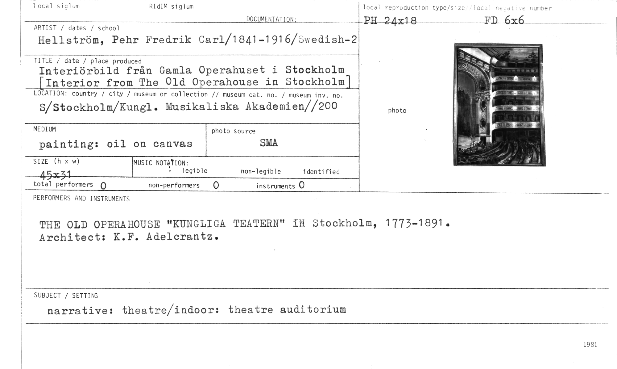 //// 1 otal siglum RIdIM siglum //// lotal reproduction type/size local ne2,ativc number //// FD 6x6 //// DOCUMENTATION: PH 24x18 //// ARTIST / dates / school //// Hellström, Pehr Fredrik Carl/1841-1916/Swedish-2 //// TITLE / date / place produced //// Interiörbild från Gamla Operahuset i Stockholm Interior from The Old Operahouse in Stockholm 1 //// photo //// photo source //// SMA //// SIZE (h x w) //// 45x31 //// total performers 0 non-performers 0 instruments 0 //// PERFORMERS AND INSTRUMENTS //// THE OLD OPERAHOUSE "KUNGLIGA TEATERN" IN Stockholm, 1773-1891. Architect: K.F. Adelcrantz. //// SUBJECT / SETTING //// narrative: theatre/indoor: theatre auditorium //// LOCATION: country / city / museum or collection // museum cat. no. / museum inv. no. //// S/Stockholm/Ku ngl. Musikaliska Akademien//200 //// MEDIUM //// painting: oil on canvas //// MUSIC NOTATION: //// legible non-legible identified //// 1981 ////