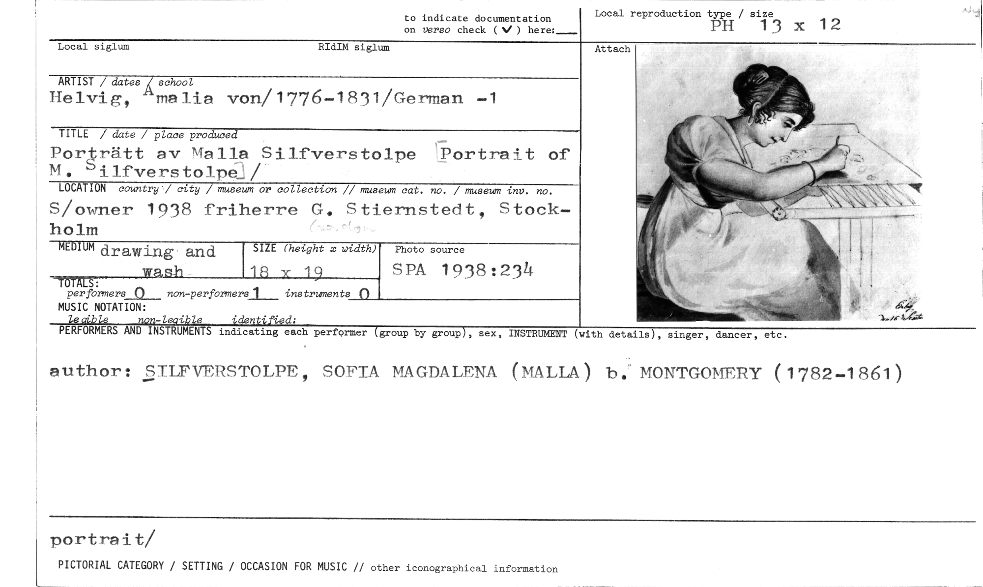 //// to indicate documentation //// on verso check (V) here: __-- //// Local reproduction tfp)fr / aile3 //// 12 //// Local siglum RIdIM siglum //// ARTIST / dates ( school //// Helvig, 'malla von/1776 -1831/German -1 //// TITLE / date / place produced //// Porätt av Malla Silfverstolpe 17P //// r ortrait of //// M. 'ilfverstolpe3/ //// LOCATION country./ city / museum or collection // museum cat. no. / museum inv. no. //// S/owner 1938 friherre G. Stiernstedt, Stockholm //// SIZE (height x width) //// MUSIC NOTATION: //// nnp-leaible identified: //// PERFORMERS AND INSTRUMENTS indicating each //// author: STLFVERSTOLPE, SOFIA MAGDALENA (MALLA) b. MONTGOMERY (1782-1861) //// Attach //// MEDIUM drawing and //// S: //// perprmers () non-perforners_l___ instruments () //// Photo source //// SPA 1938:234 //// performer (group by group), sex, INSTRUMENT (with datona), singer, daner, etc. //// pOrtr8it/ //// PICTORIAL CATEGORY / SETTING / OCCASION FOR MUSIC // other iconographical information ////