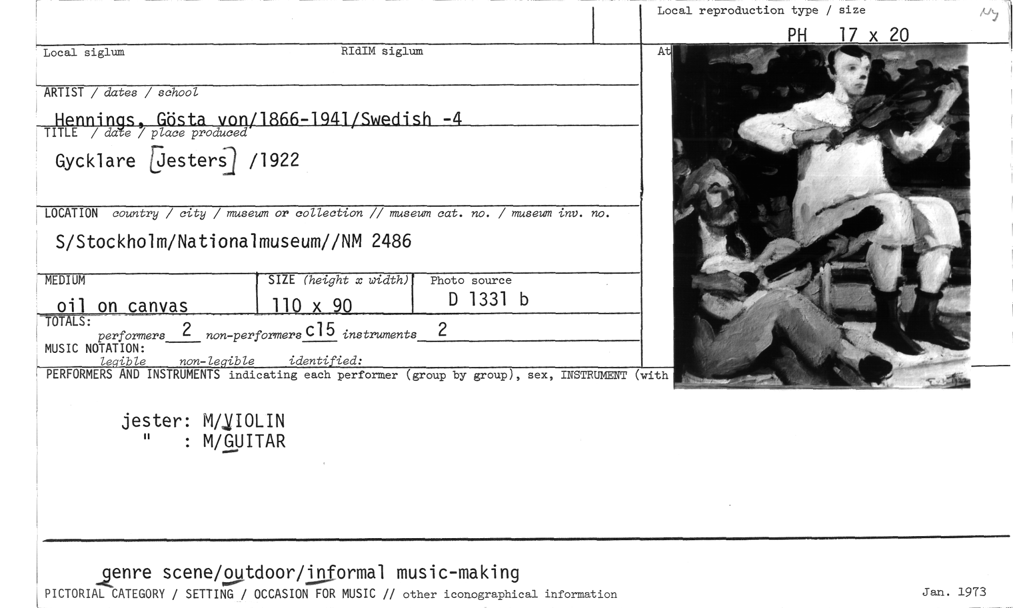 //// jester: MaIOLIN " : M/GUITAR //// genre scene/outdoor/informal music-making //// PICTORIAL CATEGORY / SETTING / OCCASION FOR MUSIC // other iconographical information //// Jan. 1973 //// Local siglum //// RIdIM siglum //// Local reproduction type / size //// PH 17 x 20 //// ARTIST / dates / school //// Hpnnings, Gista von/1866-1941/Swedish -4 TITLE / daTe / place produced //// Gycklare gesters] /1922 //// LOCATION country / city / museum or collection // museum cat. no. / museum -znv. no. //// S/Stockholm/Nationalmuseum//NM 2486 //// MEDIUM //// performers 2 non-performers Cl 5 instruments 2 MUSIC NOTATION: //// Zegible non-legible identified: //// PERFORMERS AND INSTRUMENTS indicating each performer (group by group), sex, INSTRUMENT (with //// oi on canvas TOT LS: ////