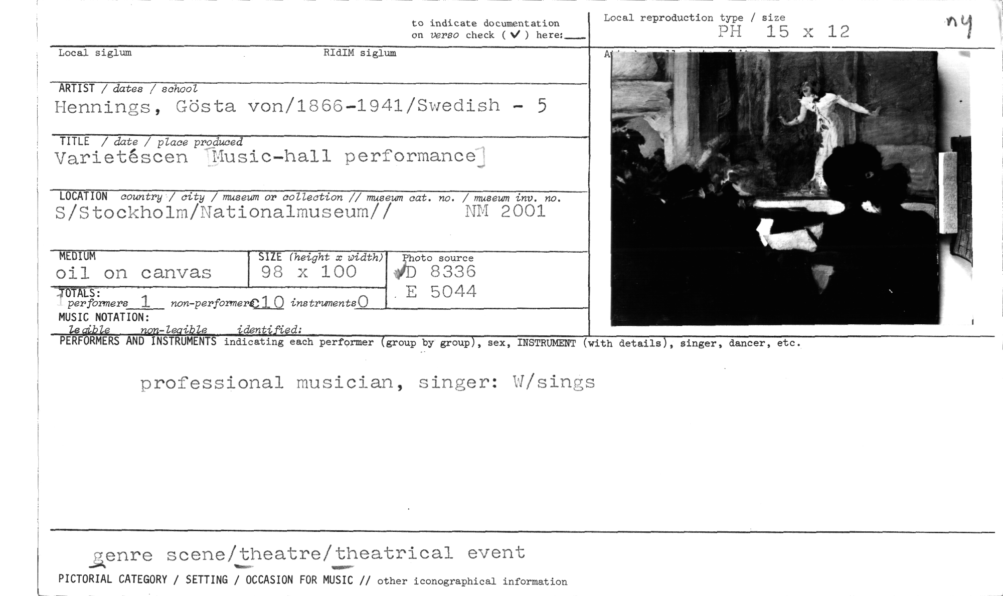 //// to indicate documentation Local reproduction type / size //// on verso check ( V) here:_ PH 15 x 12 //// Local siglum RIdIM siglum //// ARTIST / dates / school //// Hennings, Gösta von/1866-1941/Swedish 5 //// TITLE / date / place produced //// Variet6scen performance //// LOCATION countryj city / museum or collection // museum cat. no. / museum tnv. no. //// S/Stockholm/Nationalmuseum// NM 2001 //// MEDIUM //// 011 on canvas //// SIZE (height x width) //// 98 x 100 //// oro source 8336 E 5044 //// bTAlt: //// performers 1 non -performeren instruments() MUSIC NOTATION: //// leaible non-leaible identified: //// PERFORMERS AND INSTRUMENTS indicating each performer (group by group), sex, INSTRUMENT (with details), singer, dancer, etc. //// professional musician, singer: W/sings //// «onre scene/theatre/theatrical event //// PICTORIAL CATEGORY / SETTING / OCCASION FOR MUSIC // other iconographical information ////