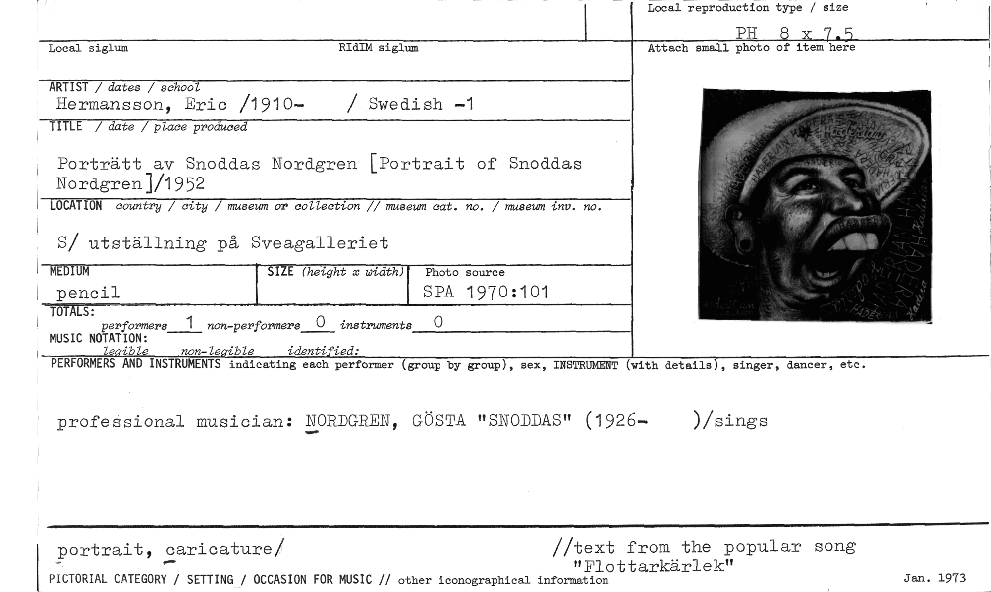//// Local siglum RIdIM siglum //// Local reproduction type / size //// PH //// Attach small photo of item here //// ARTIST / dates / school //// Hermansson, Eric /1910— Swedish —1 //// TITLE / date / place produced //// Porträtt av Snoddas Nordgren [Portrait of Snoddas Nordgren]/1952 //// LOCATION country / city / museum or collection // museum cat. no. / museum inv. no. //// S/ utställning på Sveagalleriet //// MEDIUM SIZE (height x width) Photo source //// pencil SPA 1970:101 //// //// rummr- //// performers 1 non-perförmers 0 instruments 0 MUSIC NOTATION: //// le ible non-le.ible identi ied: //// PERFORMERS AND INSTRUMENTS indicating each performer (group by group), sex, INSTRUMENT (with details , singer, dancer, et //// professional musician: NORDGREN, GÖSTA "SNODDAS" (1926— )/sings //// portrait, caricature/ //text from the populan song //// "Flottarkärlek" //// PICTORIAL CATEGORY / SETTING / OCCASION FOR MUSIC // other iconographical information //// Jan. 1973 //// ////