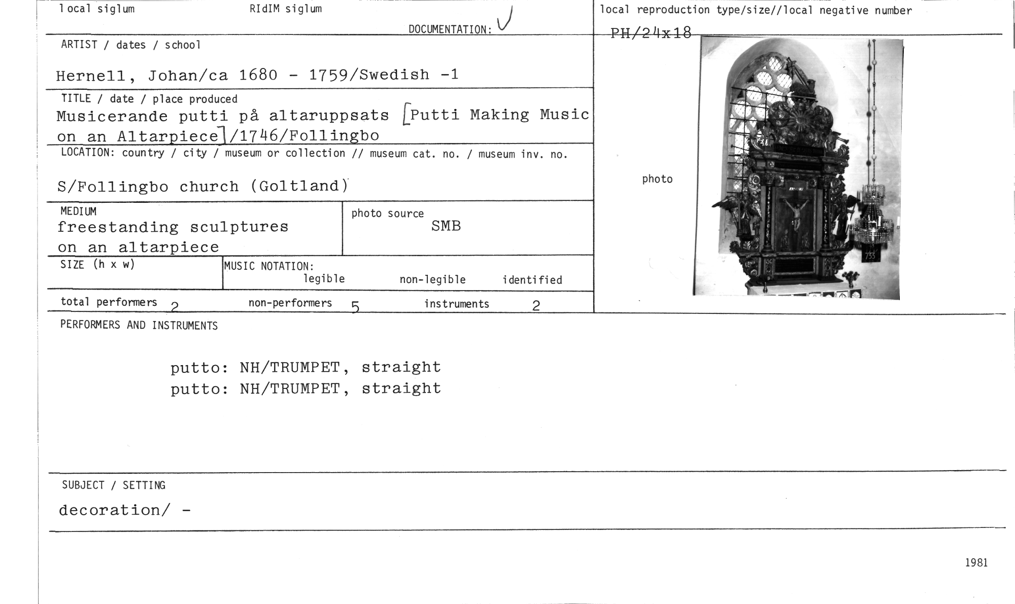 //// r 1 ocal siglum RIdIM siglum //// local reproduction type/size//local negative number //// DOCUMENTATION: //// ARTIST / dates / school //// Hernell, Johan/c a 1680 - 1759/Swedish -1 //// Musicerande putti på altaruppsats EPutti Making Music //// TITLE / date / place produced //// on an Altarpiece3/1746/Follingbo //// LOCATION: country / city / museum or collection // museum cat. no. / museum inv. no. //// S/Follingbo chur ch (Goltiand) //// MEDIUM //// freestanding scu lptures on an altarpiece //// SIZE (h x w) //// non-legible identified //// total performers 2 non-performers 5 instruments 2 //// MUSIC NOTATION: //// legible //// photo source //// SMB //// photo //// i 8 //// PERFORMERS AND INSTRUMENTS //// putto: NH/TRUMPET, straight //// putto: NH/TRUMPET, straight //// SUBJECT / SETTING //// decoration/ - //// 1981 ////