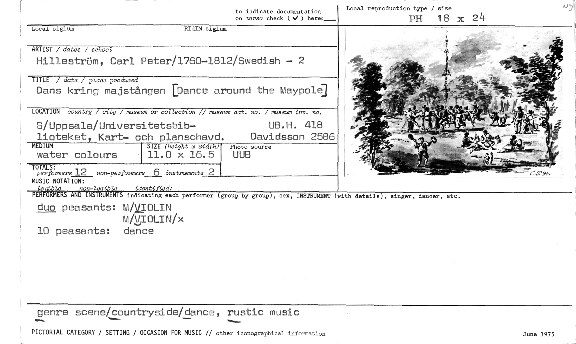 //// to indicate documentation Local reproduction type / size //// on verso check (V ) here: PH 18 x 24- //// Local siglum RIdIM siglum //// ARTIST / dates / school //// Hilleström, Carl Peter/1760-1812/Swedish — 2 //// TITLE / date / place produced //// Dans kring majstången [Dance around the Maypole] //// LOCATION country / city / museum or collection // museum cat. no. / museum inv. no. //// S/Uppsala/Universitetsbib— UB.H. 418 //// lioteket, Kart— och planschavd. Davidsson 2586 //// MEDIUM SIZE (height x width) Photo source //// water colours 11.0 x 16.5 UUB //// -TOTALS: //// per formers 12 non-performers 6 instruments 2 //// MUSIC NOTATION: //// -Z i //// PERFORMERS AND INSTRUMENTS indicating each performer //// duo peasants: M/VIOLIN //// M/gIOLIN/x //// 10 peasants: dance //// group by group , sex, INSTRUMENT (with details , singer, dancer, et //// genre scene/countryside/dance, rustic music //// PICTORIAL CATEGORY / SETTING / OCCASION FOR MUSIC // other iconographical information //// June 1975 ////
