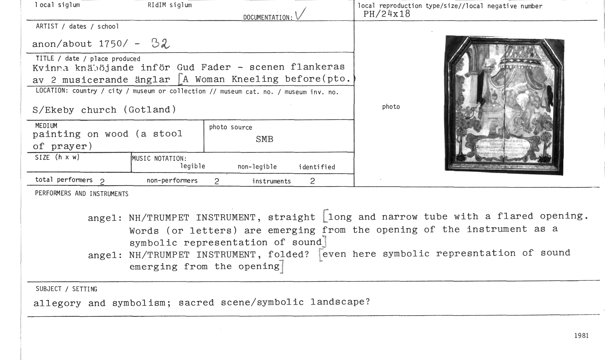//// 1 ocal siglum RIdIM siglum //// DOCUMENTATION: / //// local reproduction type/size//local negative number //// PH/24x18 //// ARTIST / dates / school //// anon/about 1750/ — //// TITLE / date / place produced //// Kvinna knäJöjande inför Gud Fader - scenen flankeras av 2 musicerande änglar LA Woman Kneeling before(pto.I //// LOCATION: country / city / museum or collection // museum cat. no. / museum inv. no. //// S/Ekeby church (Gotland) //// photo source //// SMB //// SIZE (h x w) //// MEDIUM //// painting on wood (a stool of prayer) //// MUSIC NOTATION: //// legible non-legible identified //// photo //// total performers 2 non-performers instruments 2 //// PERFORMERS AND INSTRUMENTS //// angel: NH/TRUMPET INSTRUMENT, straight Elong and narrow tube with a flared opening. Words (or letters) are emerging from the opening of the instrument as a symbolic representation of sound] //// angel: NH/TRUMPET INSTRUMENT, folded? reven here symbolic represntation of sound emerging from the opening] //// SUBJECT / SETTING //// allegory and symbolism; sacred scene/symbolic landscape? //// 1981 ////