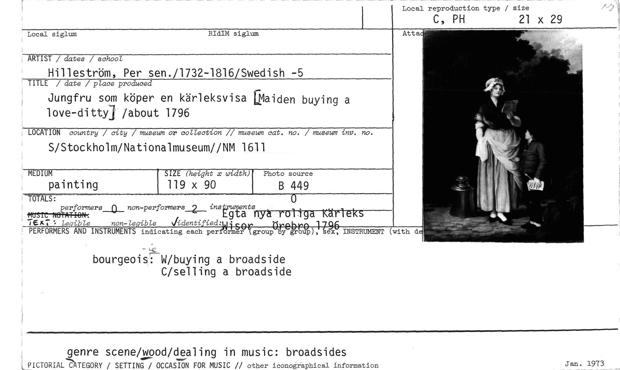 //// Local reproduction type / size //// C, PH 21 x 29 //// Local siglum RIdIM siglum //// ARTIST / dates / school //// Hilleström, Per sen./1732-1816/Swedish -5 //// TITLE / date / place produced //// Jungfru som köper en kärleksvisa Waiden buying a love-dittyg /about 1796 //// LOCATION country / city / museum or collection // museum cat. no. / museum inv. no. //// S/Stockholm/Nationalmuseum//NM 1611 //// SIZE (height x width) 119 x 90 //// 71-043P //// performers_a_ t //// non-performers_2_ instruments //// tettit-iffitiff-~ Ega //// ex.7'. Le ible non-Te ibLe Jidenti ied: //// PERFORMERS AND INSTRUMENTS indicating each per ormer //// MEDIUM //// painting //// Photo source //// B 449 //// 0 //// bourgeois: W/buying a broadside C/selling a broadside //// sex, INSTRUMENT (with d //// LPICTORIACNTEGORY / SETTING / OCCASION FOR MUSIC // other iconoåraphical information //// genre scene/wood/dealing in music: broadsides //// Jan. 1973 ////