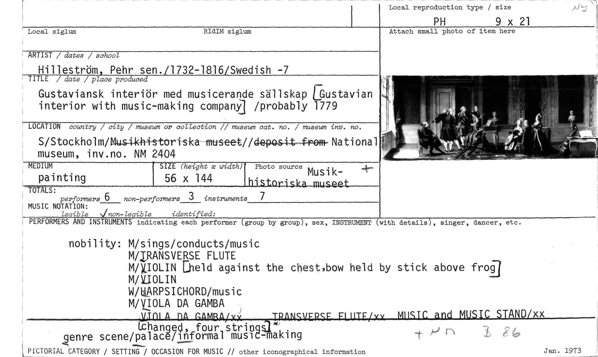 //// Local reproduction type / size //// PH 9 x 21 //// Local siglum RIdIM siglum Attach small photo of item here //// ARTIST / dates / school //// Hilleström, Pehr sen./1732-1816/Swedish -7 //// TITLE / date / place produced //// Gustaviansk interiör med musicerande sällskap {Gustavian interior with music-making company /probably 1779 //// LOCATION country / city / museum or collection // museum cat. no. / museum inv. no. //// S/Stockholm/Mus-i-kkiito-ri ska tituseet//€1"-~ National museum, inv.no. NM 2404 //// MEDIUM SIZE (height x width) Photo source Musik- //// painting 56 x 144 Jaistar_tsk.a_nuseP--t-- //// 3 instruments 7 //// TOTALS: 6 non -performers //// performers //// MUSIC NOTATION: non-le ible identi ied: //// le ible //// PERFORMERS AND INSTRUMENTS indicating each performer (group by group), sex, INSTRUMENT (with details), singer, dancer, etc. //// nobility: M/sings/conducts/music //// WIRANSVERSE FLUTE //// M/4IOLIN Dield against the chest,bow held by stick above frog M/VIOLIN //// W/UARPSICHORD/music //// MDLIOLA DA GAMBA //// ljnIA fA_GAN /Yy TPANCVFPU FIHTF/Yv MIMI: and MUSIC STAND/xx //// Ichang0, four strinqW //// genre scene/palace/informal music-making -t- P n //// PICTORIAL CATEGORY / SETTING / OCCASION FOR MUSIC // other iconographical information //// Jan. 1973 ////