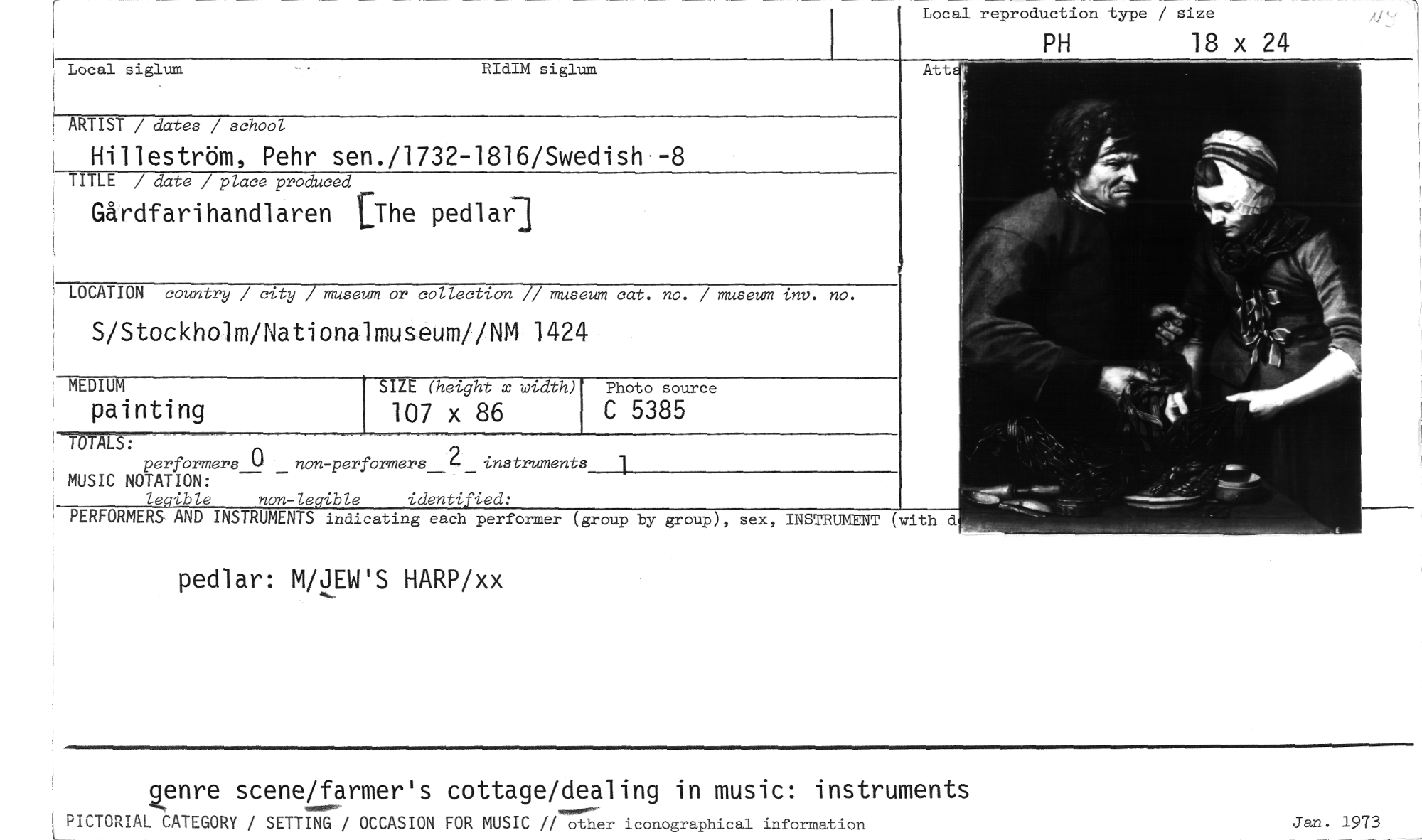 //// pedlar: M/JEW'S HARP/xx //// Local reproduction type / size //// PH 18 x 24 //// Local siglum RIdIM siglum //// ARTIST / dates / school //// Hilleström, Pehr sen./1732-1816/Swedish--8 //// TITLE / date / place produced //// Gårdfarihandlaren [The pedlar] //// LOCATION country / city / museum or collection // museum cat. no. / museum inv. no. //// S/Stockholmaationalmuseum//NM 1424 //// MEDIUM //// painting //// SIZE (height x width) //// 107 x 86 //// Photo source //// C 5385 //// ?OTALS: , //// 2 • //// perfbrmers U _non-performers_ _ instruments //// MUSIC NOTATION: //// le•ible non-le•ible identi ied: //// PERFORMERS AND INSTRUMENTS indicating each performer (group by group), sex, //// 1 //// INSTRUMENT (with d //// genre scene/farmer's cottage/dealing in music: instruments //// LPICTORIAL CATEGORY / SETTING / OCCASION FOR MUSIC // other iconographical information //// Jan. 1973 ////