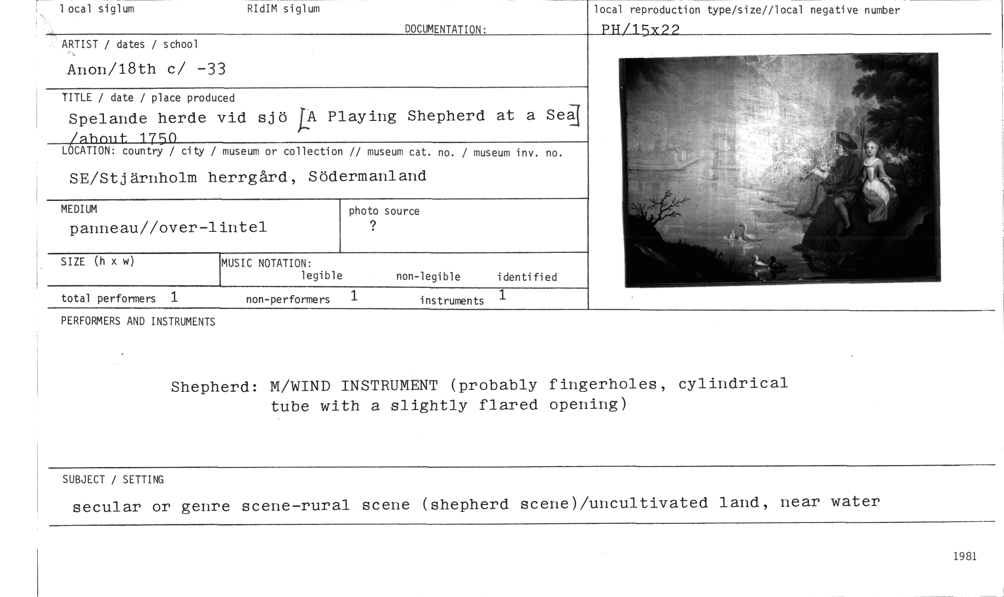 //// 1 ocal siglum RI dIM siglum //// ARTIST / dates / school //// local reproduction type/size//local negative number //// PT-T/15x22 //// DOCUMENTATION: //// Anon/18th c/ -33 //// TITLE / date / place produced //// Spelande herde vid sjö LA Playing Shepherd at a Seg //// /ahnut 1750 //// LOCATION: country / city / museum or collection // museum cat. no. / museum inv. no. //// SE/Stjärnholm herrgård, Södermanland //// //// MEDIUM photo source //// panneau//over-lintel //// //// SIZE (h x w) MUSIC NOTATION: //// legible non-legible i denti fi ed //// //// //// total perforiners 1 non-performers 1 instruments 1 //// PERFORMERS AND INSTRUMENTS //// Shepherd: M/WIND INSTRUMENT (probably fingerholes, cylindrical tube with a slightly flared opening) //// SUBJECT / SETTING //// secular or genre scene-rural scene (shepherd scene)/uncultivated land, near water //// 1981 ////