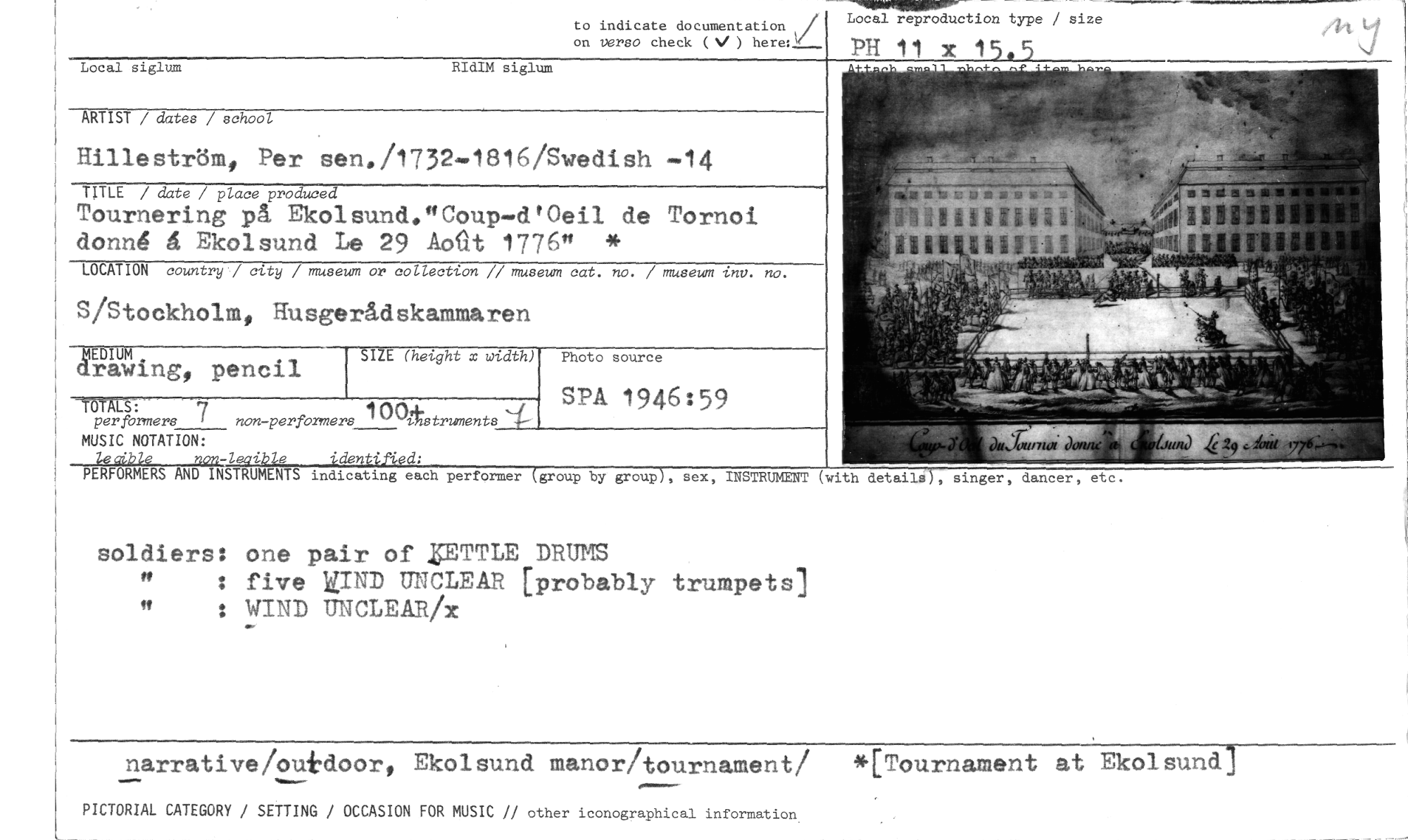 //// Local reproduction type / size //// to indicate documentation //// on verso check (V) here: V// //// -- PH 11 x 15.5 //// Local siglum RIdIM siglum //// ARTIST / dates / school //// Hilleström, Per sen./1732-1816/Swedish —14 //// TITLE / date / place produced //// Tournering på Ekolsund."Coup—d'Oeil de Tornoi donn4 å Ekolsund Le 29 A4-b 1776" * //// LOCATION country / city / museum or collection // museum cat. no. / museum inv. no. //// 3/Stockholm, Husgerådskammaren //// MEMM //// drawing, pencil //// TWAF-S-: //// per formers 7 non -performers 1()°Astrument MUSIC NOTATION: NOTATION: //// non-lecihle //// PERFORMERS AND INSTRUMENTS indicating each performer (group by group), sex, INSTRUMENT (with details), singer, dancer, etc. //// soldiers: one pair of ZETTLE DRUMS //// " : five UNCLEAR [probably trumpets] //// " : WIND UNCLEAR/x //// SIZE (hevght x width) //// Photo source //// SPA 1946:59 //// narrative/oufdoor, Ekolsund manor/tournament/ //// PICTORIAL CATEGORY / SETTING / OCCASION FOR MUSIC // other iconographical information //// *[Tournament at Ekolsund] ////