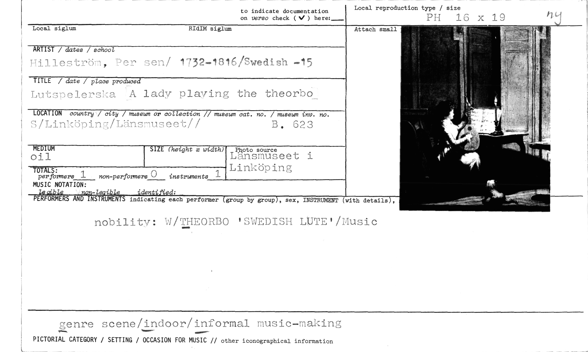 //// genre scene/indoor/informal music-making //// PICTORIAL CATEGORY / SETTING / OCCASION FOR MUSIC // other iconographical information //// to indicate documentation //// on verso check ( ) here:_ //// Local siglum RIdIM siglum //// ARTIST / dates / school //// Per sen/ 1732-1816/Swedish -15 //// TITLE / date / pZUW7g77.172 //// Lutsoelerska A lady playing the theorbo //// LOCATION country / city / museum or collection // museum cat. no. / museum vnv. no. //// S/Linköping/Länsmuseet// B. 623 //// Local reproduction type / size //// Pil 13 x //// n //// MEDIUM //// oil //// "TrilrF--- //// per formera i non-performers () instruments //// MUSIC NOTATION: //// i• e 'de //// MERS AND INST MENTS indicating each performer //// Photo source //// Länsmuseet i Linköping //// by group , sex, INSTRUMENT (with detaila), //// SIZE (height m width) //// group //// nobility: W/THEORBO 'SWEDISH LUTE'/Music ////