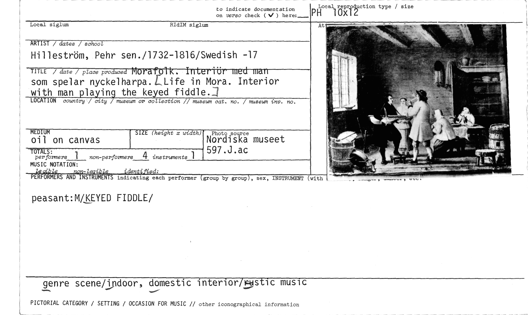 //// to indicate documentation on verso check (V) here: PHLocal 10x repro1duction type / size //// Local siglum RIdIM siglum //// ARTIST / dates / school //// Hilleström, Pehr sen./1732-1816/Swedish -17 //// .— //// TITLE date / place produced Mora o rueriur nid111d11 //// som spelar nyckelharpa.flife in Mora. Interior //// with man playing the keyed fiddle.j //// LOCATION country / city / museum or collection // museum cat. no. / museum inv. no. //// MEDIUM //// oil on canvas SIZE (height x width) //// TOTALS: //// perfbrmers 1 non-per formers 4 instruments 1 //// MUSIC NOTATION: //// le aible non-lanible //// PERFORMERS AND INSTRUMENTS indicating each performer (group by group), sex, INSTRUMENT (with //// peasant:M/KEYED FIDDLE/ //// genre scene/lpdoor, domestic interiorightstic music //// PICTORIAL CATEGORY / SETTING / OCCASION FOR MUSIC // other iconographical information //// At //// Photo.source //// Nordiska museet 597.J.ac ////