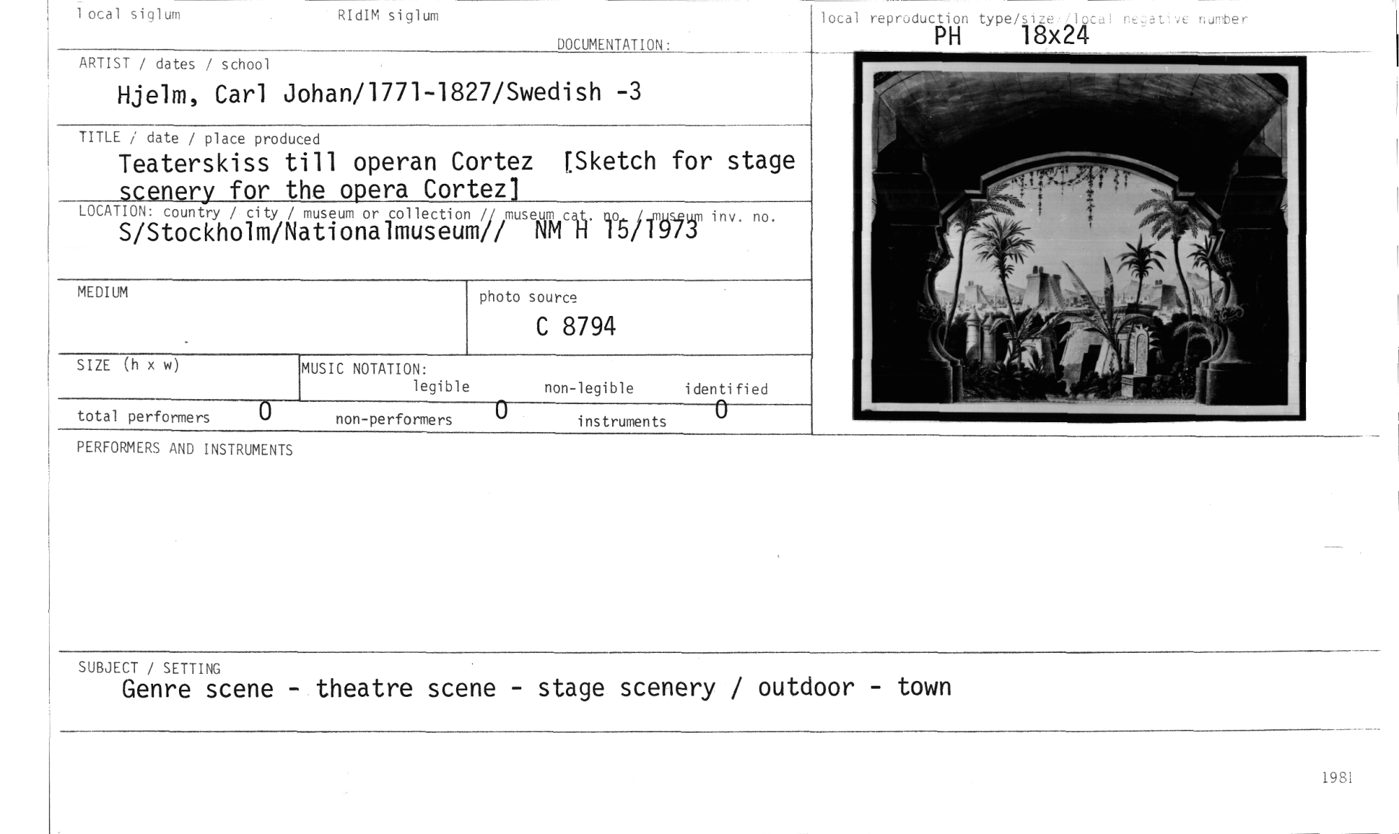 //// 1 ocal siglum RIdIM siglum //// DOCUMENTATION: //// ARTIST / dates / school //// Hjelm, Carl Johan/1771-1827/Swedish -3 //// TITLE / date / place produced //// Teaterskiss till operan Cortez [Sketch for stage //// scenery for the opera Cortez] //// LOCATION: country / city / museum or collection // museum cat. mf inv. no. //// S/Stockholm/Nationalmuseum// NM H 15/ilo //// photo source //// C 8794 //// SIZE (h x w //// non-legible identified //// total performers non-performers instruments lotal reproduction type/size x i negat. //// PH l8 24 //// MEDIUM //// MUSIC NOTATION: //// legible //// PERFORMERS AND INSTRUMENTS //// SUBJECT / SETTING //// Genre scene - theatre scene - stage scenery / outdoor - town //// 19 81 ////