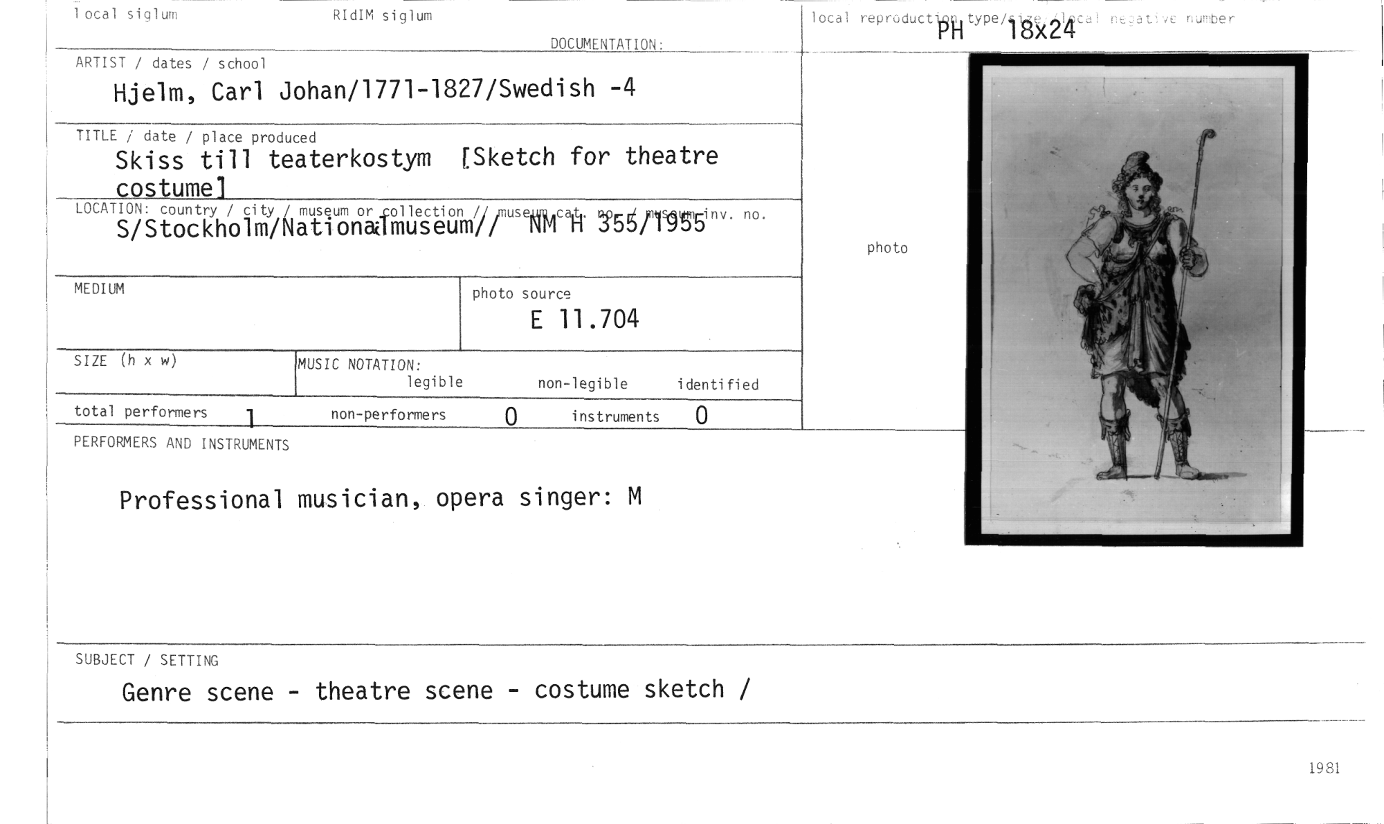 //// 1 ocal siglum //// RIdIM siglum //// DOCUMENTATION: //// ARTIST / dates / school //// Hjelm, Carl Johan/1771-1827/Swedish -4 //// lotal reproduction. //// PH tYPel 8x24- nurober //// TITLE / date / place produced //// Skiss till teaterkostym [Sketch for theatre //// costumel //// LOCATION: country / city / museum or_collection /! musefflical. mg)ffilyininv. no. //// S/Stockholm/Nationadmuseum// //// photo //// MEDIUM //// photo source //// E 11.704 //// SIZE (h x w //// MUSIC NOTATION: //// legible //// non-legible identified //// total performers PERFORMERS AND INSTRUMENTS //// non-performers //// Professional musician, opera singer: M //// SUBJECT / SETTING //// Genre scene - theatre scene - costume sketch / //// 1981 ////