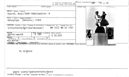 //// to indicate documentation //// on Vers(' check ( ) hereL2r_ //// `Local reproductionWe /.o+ //// sill x 15 //// Local siglum RIdIM siglum //// Attach sma //// TITLE / date / plgps produced //// Dansgrupp LDancers1 /1959 //// LOCATION country7 city / museum or collection // museum cat. no. / museum -inv. no. //// S/Stockholm/Nationalmuseum// MM 1012 NM Sk 1761 //// Photo source //// D 26.825 //// -TUALT7--- //// per formers 9 non-performers MUSIC NOTATION: //// le alble non-legible identilUd: //// PERFORMERS AND INSTRUMENTS indicating each performer (group by group), sex, INSTRUMENT //// ARTIST / dates / school //// Hjorth, Bror/1894-1968/Swedish -4 //// MEDIUM //// Rapier-macIA //// SI1N (IeW x width) //// 0 instruments //// ith details) //// M, W/dance //// genre scene/indeterminate/dance //// PICTORIAL CATEGORY / SETTING / OCCASION FOR MUSIC // other iconographical information ////