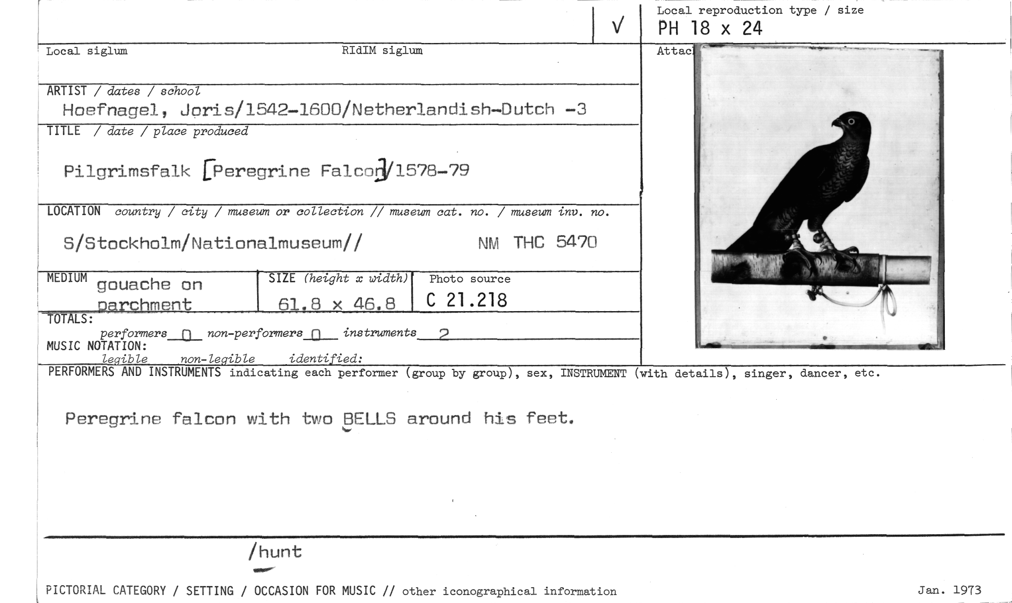 //// Local reproduction type / size //// PH 18 x 24 //// Local siglum RIdIM siglum //// ARTIST / dates / school //// Hoefnagel, Joris/1542-1600/Netherlandish-Dutch -3 //// TITLE / date / place produced //// Pilgrimsfalk [Peregrine FalcoäV1578-79 //// LOCATION country / city / museum or collection // museum cat. no. / museum inc. no. //// 5/Stockholm/Nationalmuseum// NM THC 5470 //// SIZE (height x width) //// 61.8 x 46.8 //// TOTALS: //// performers f) non -performers_u___instruments MUSIC NOTATION: //// legible non-leqible identified: //// PERFORMERS AND INSTRUMENTS indicating each performer (group by //// Peregrine falcon with two BELLS around his feet. //// 2 //// group), sex, INSTRUMENT (with details), singer, dancer, etc. //// MEDIUM gouache on //// Qarchment //// Attac //// Photo source //// C 21.218 //// /hunt //// PICTORIAL CATEGORY / SETTING / OCCASION FOR MUSIC // other iconographical information Jan. 1973 ////